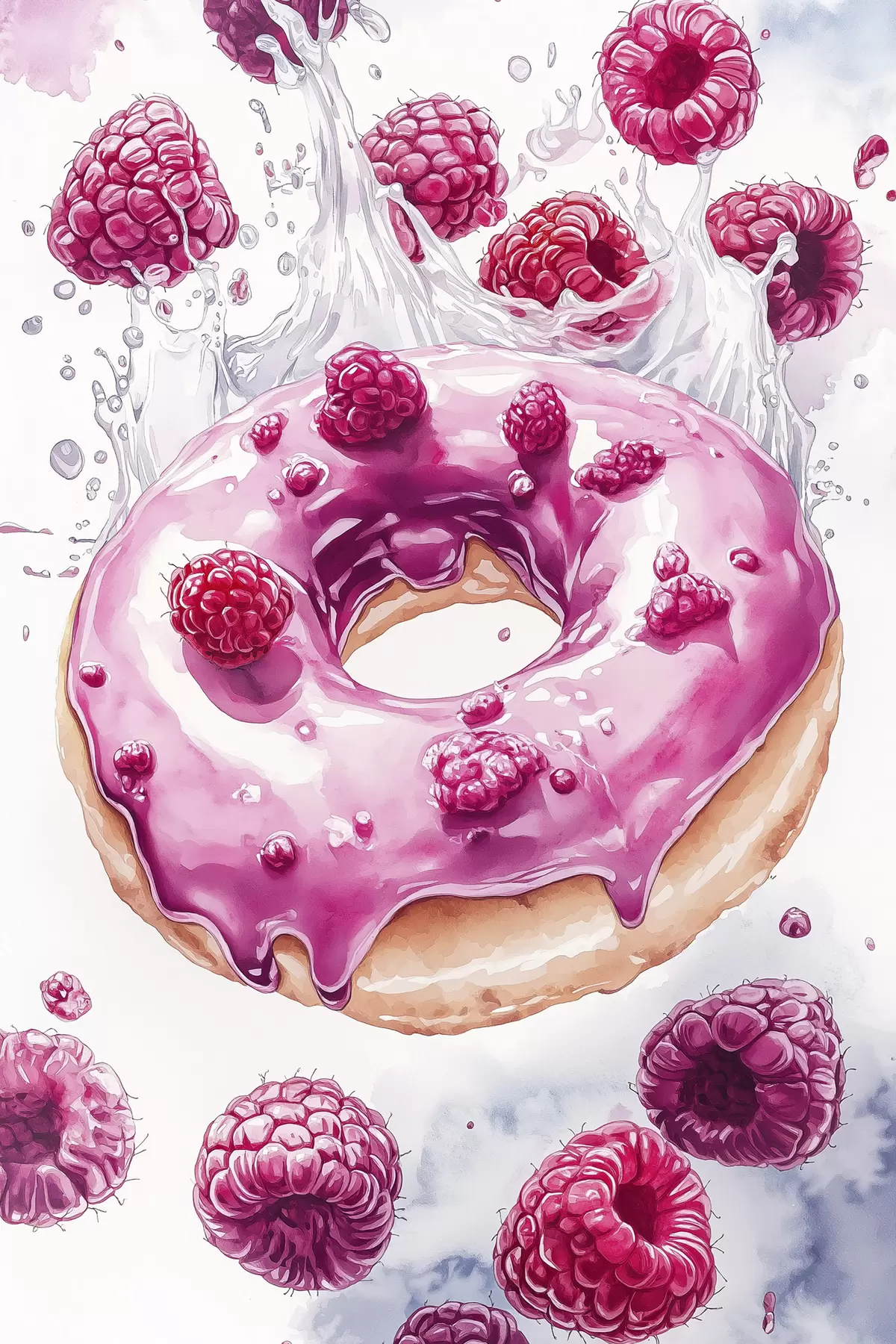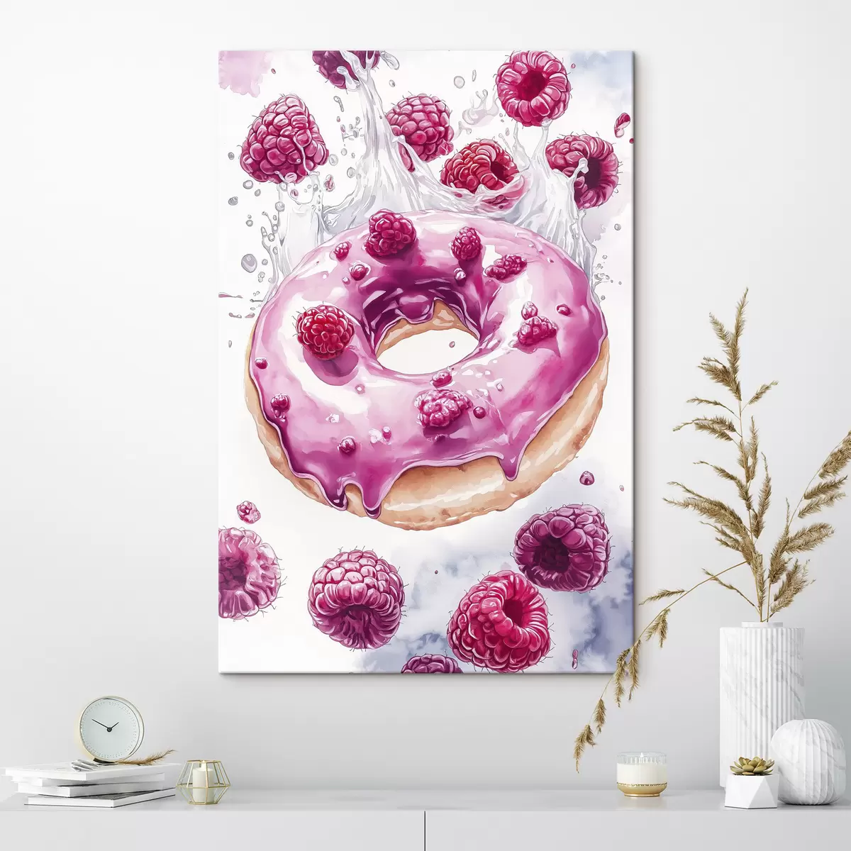 Cuadros Donat con frambuesas con glaseado rosa, delicioso postre, estilo acuarela Nr s42789