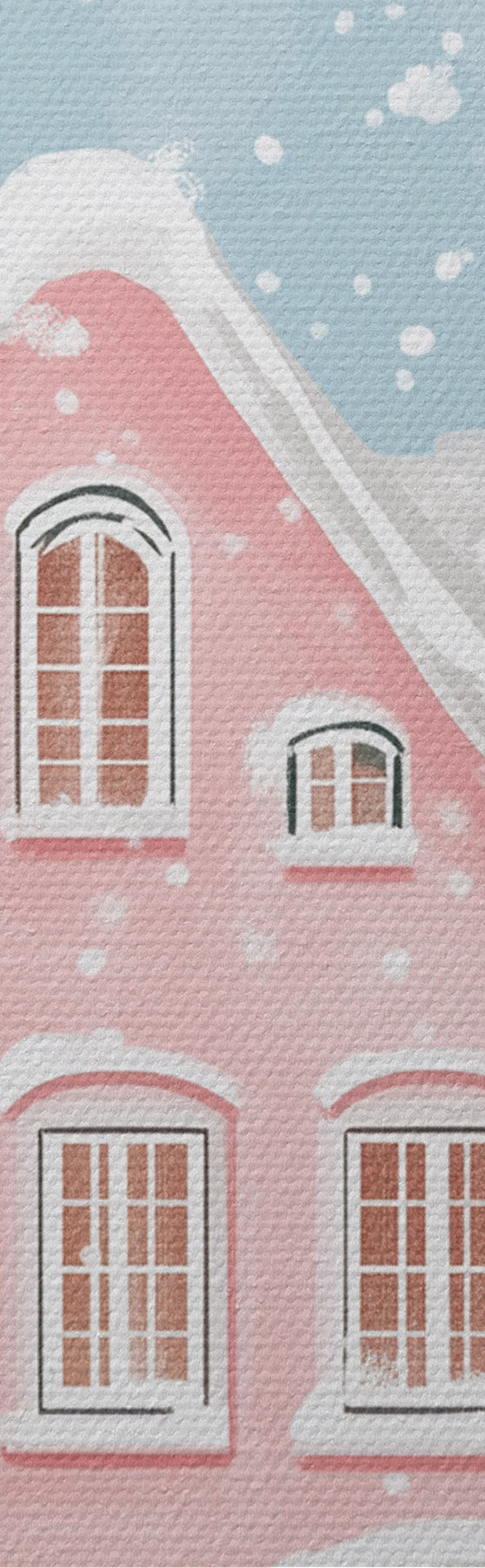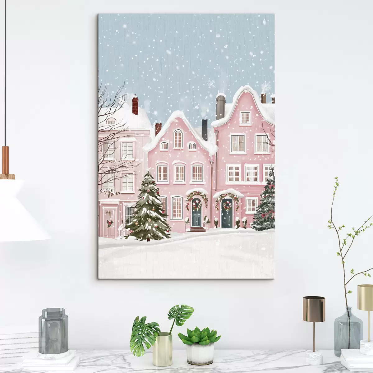 Cuadros Bonita ciudad con bonitas casas rosas, estética invernal, copos de nieve Nr s42793