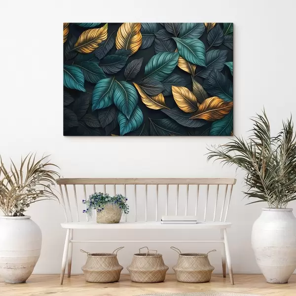 Cuadros Hojas verde oscuro, amarillo y negro con venas oscuras, en un fondo oscuro, elegante ambiente tropical Nr s43164