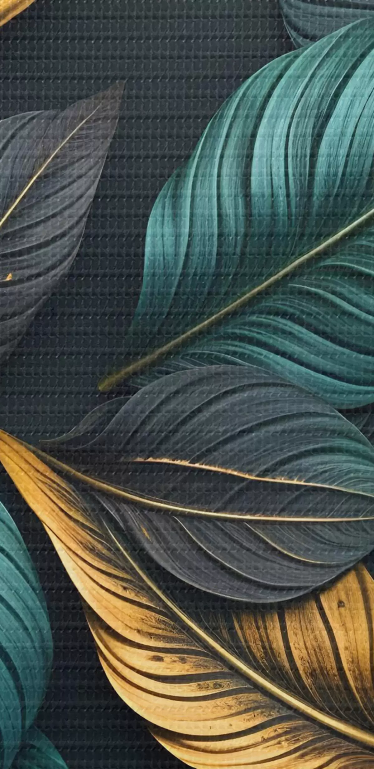 murales de pared Hojas verde oscuro, amarillo y negro con venas oscuras, en un fondo oscuro, elegante ambiente tropical s43164
