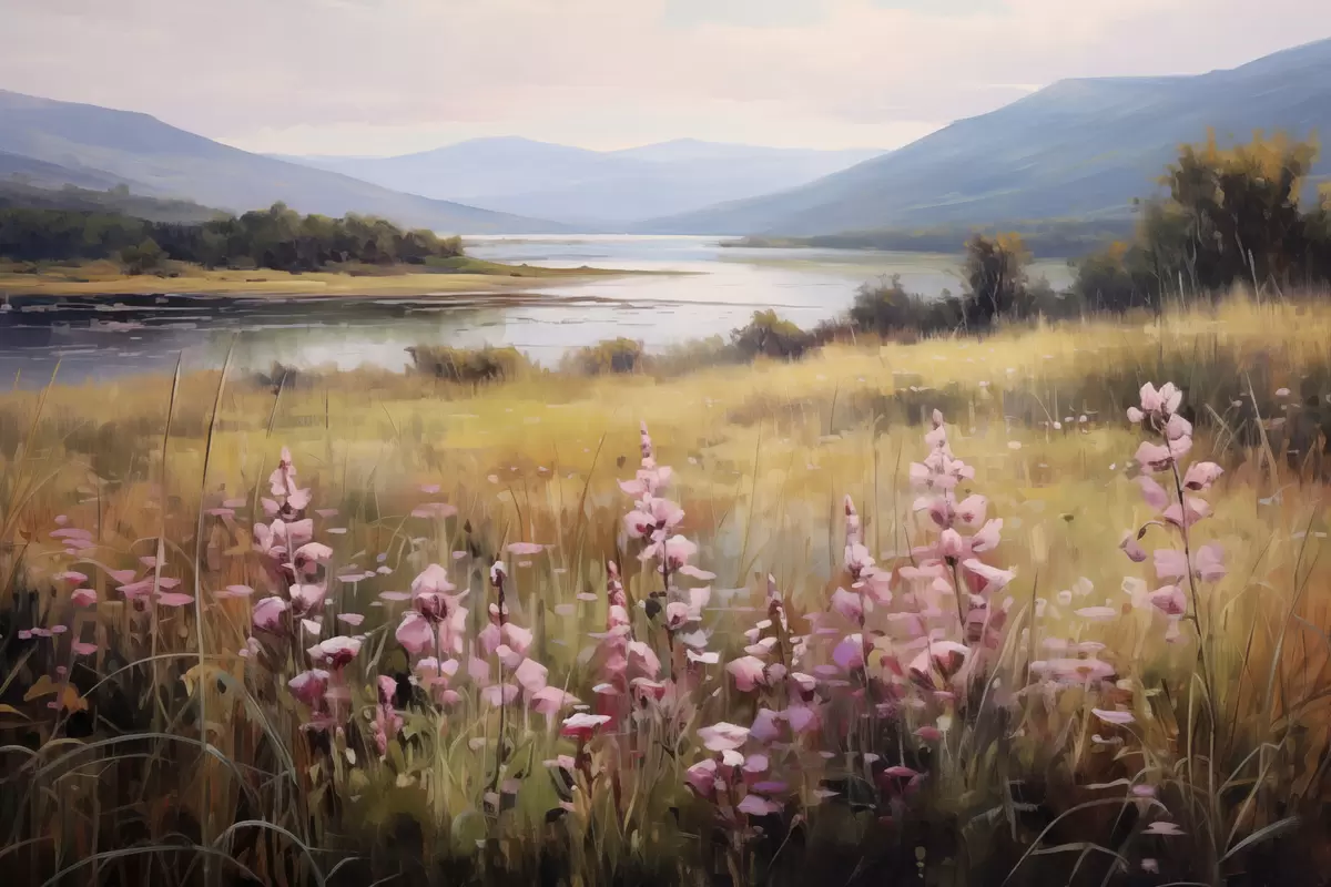 Cuadros Un paisaje con un campo de flores rosas, un lago y montañas al fondo, bajo un cielo nublado Nr s43165