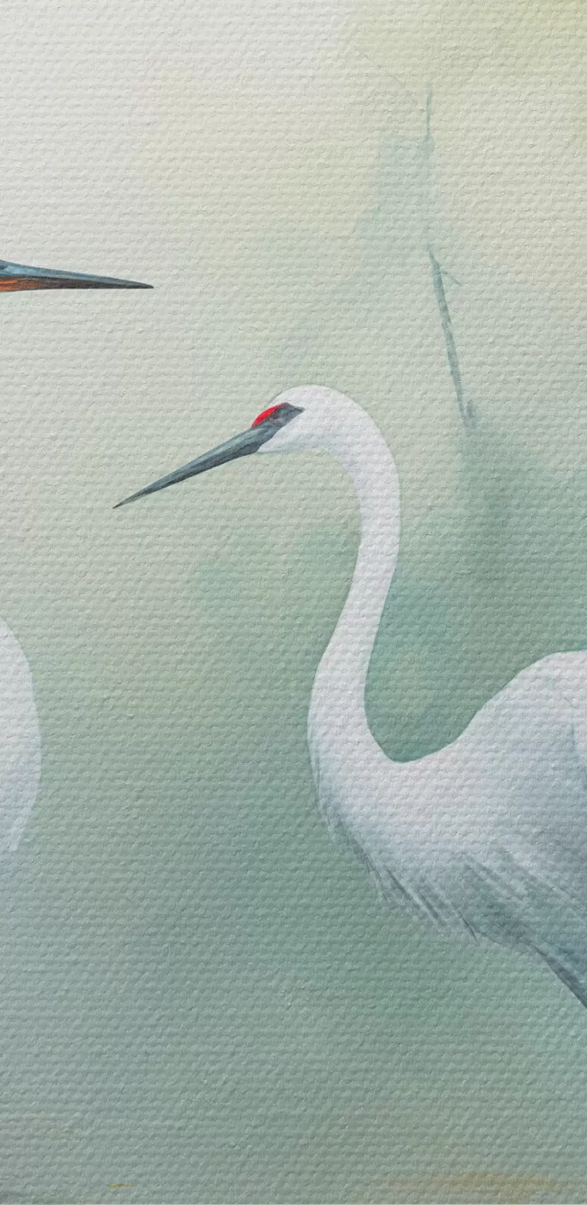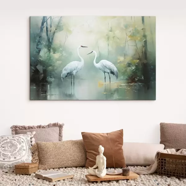 Cuadros Dos grullas blancas de pie en un estanque , rodeado de un frondoso bosque verde con iluminación suave y difusa Nr s43166