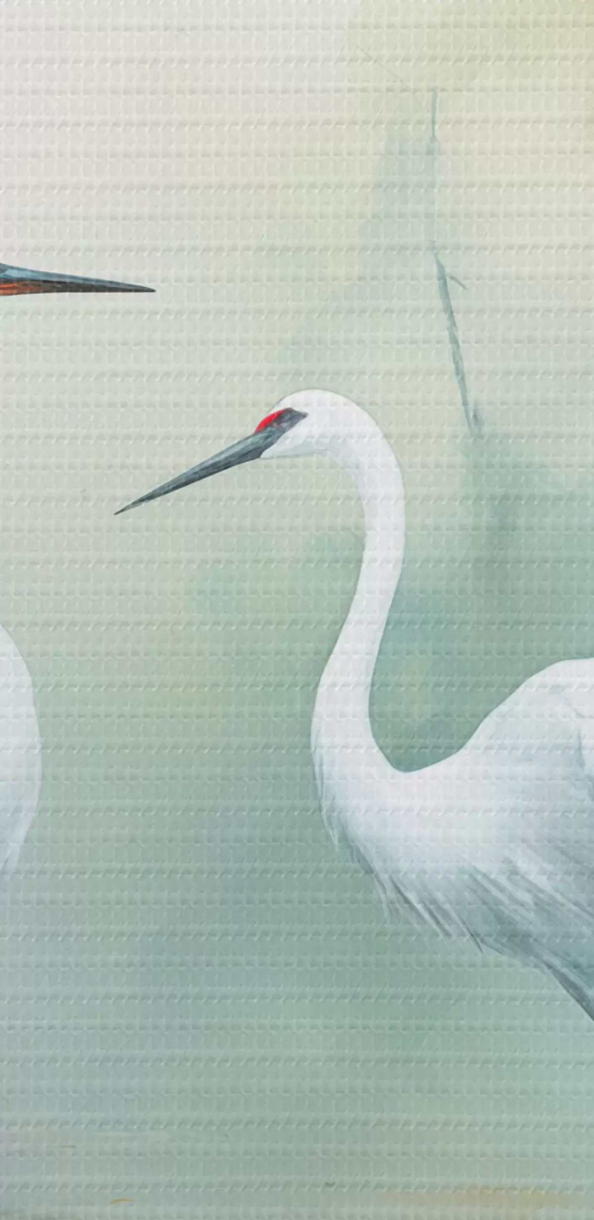 murales de pared Dos grullas blancas de pie en un estanque , rodeado de un frondoso bosque verde con iluminación suave y difusa s43166