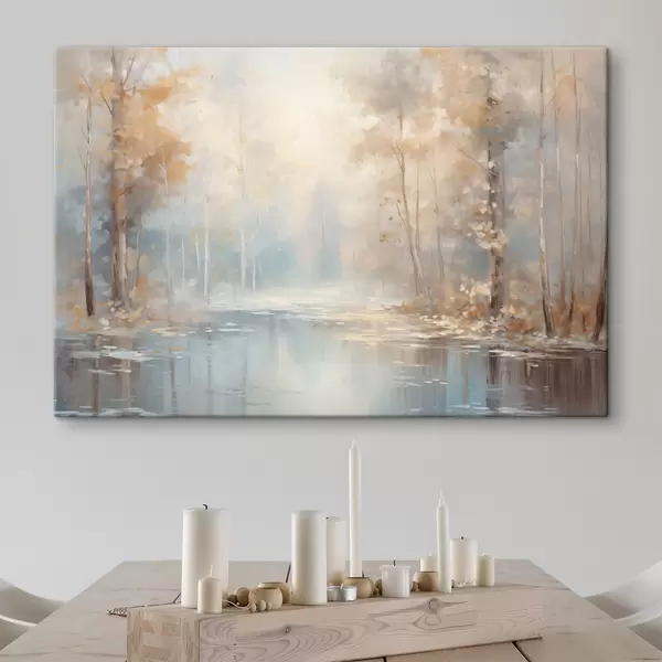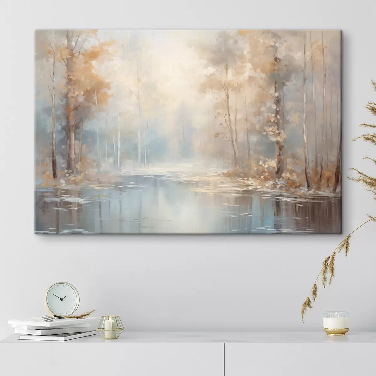 Cuadros Paisaje al óleo imitación de un río tranquilo que refleja la suave luz, rodeado de árboles otoñales Nr s43167