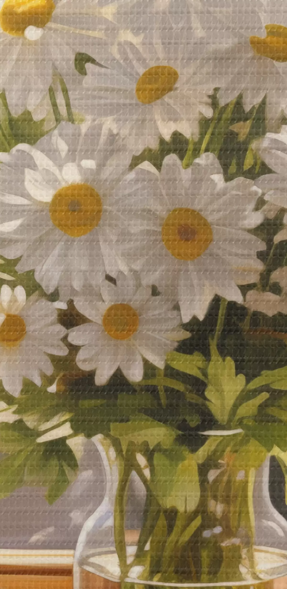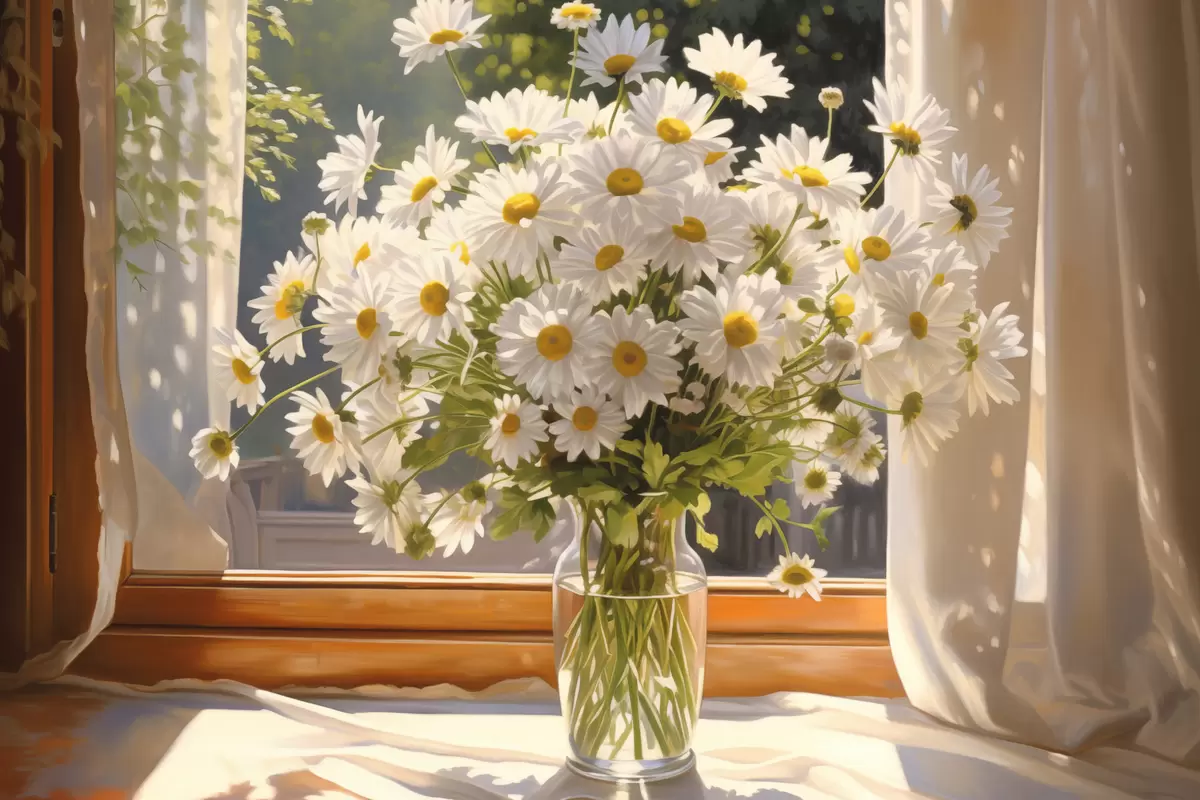 murales de pared Pintura al óleo imitación de un jarrón con margaritas blancas en el alféizar de una ventana, día soleado, paleta de colores cálidos s43171