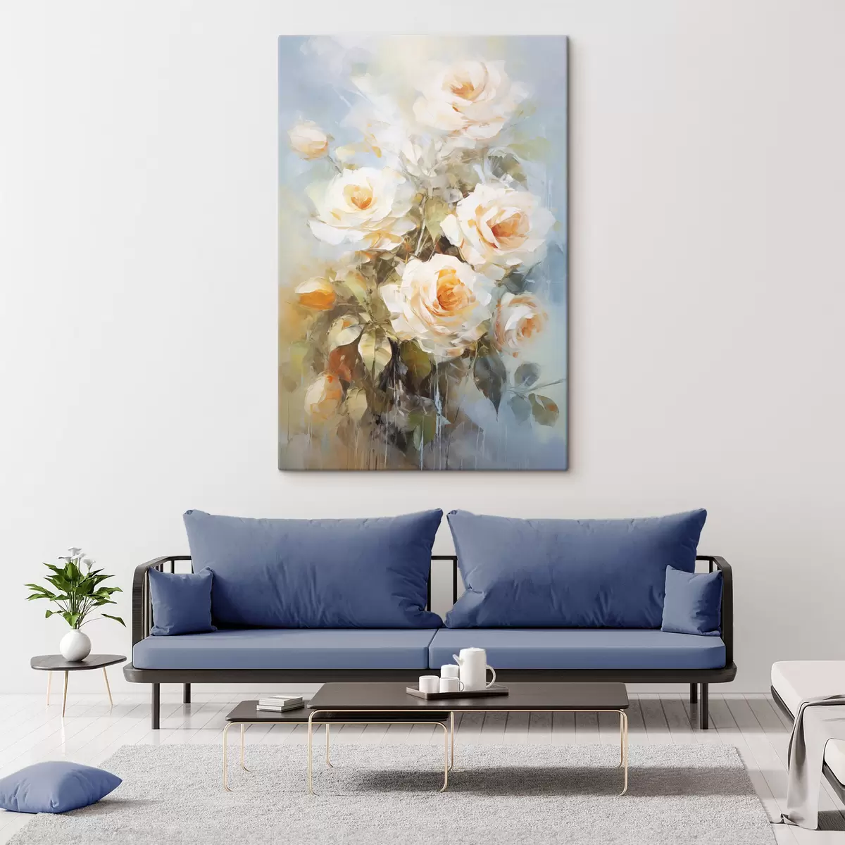 Cuadros Rosas blancas con naranja, sobre un fondo azul claro suave, con pinceladas visibles y un estilo pictórico Nr s43175