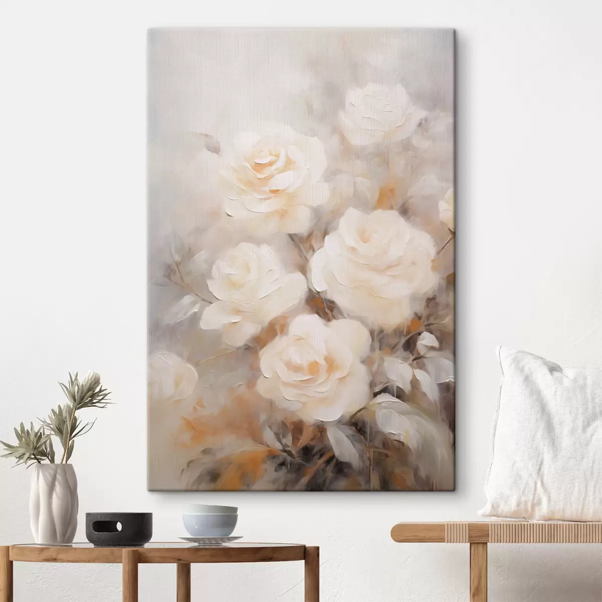 Cuadros Rosas blancas de pétalos suaves, con un fondo de colores apagados y formas difuminadas, creando un efecto de ensueño Nr s43177