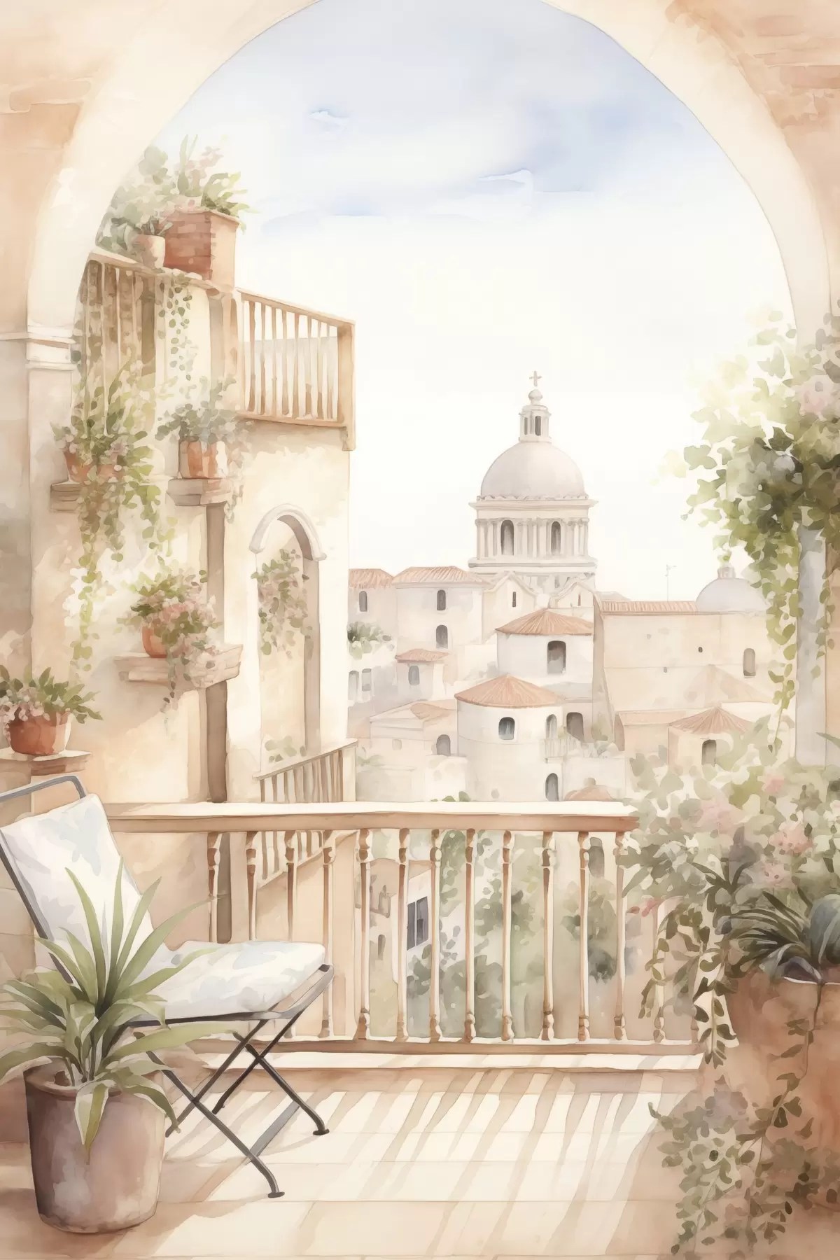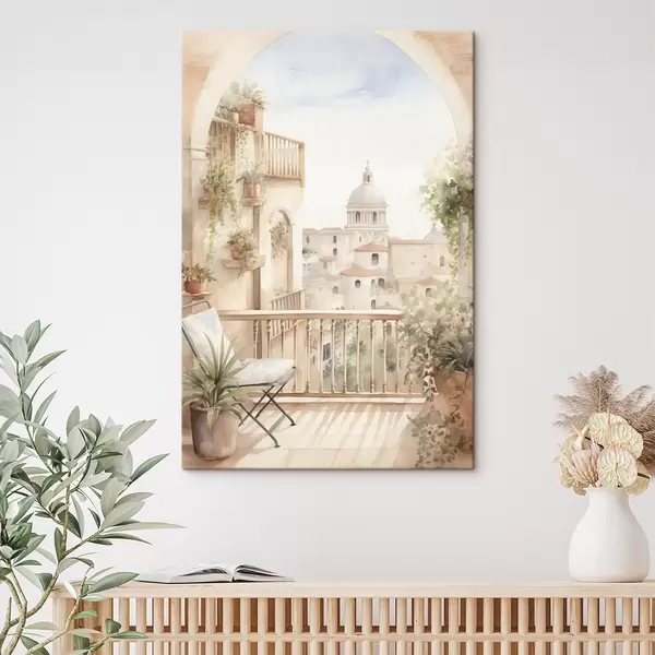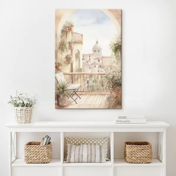 Cuadros Estética balcón de verano, España, arquitectura antigua, blomming, estilo acuarela Nr s43180