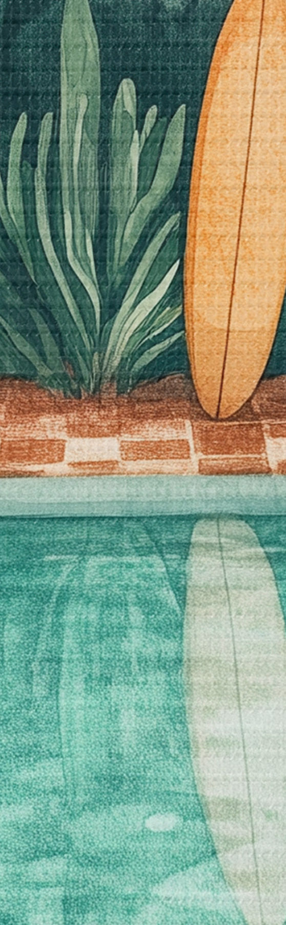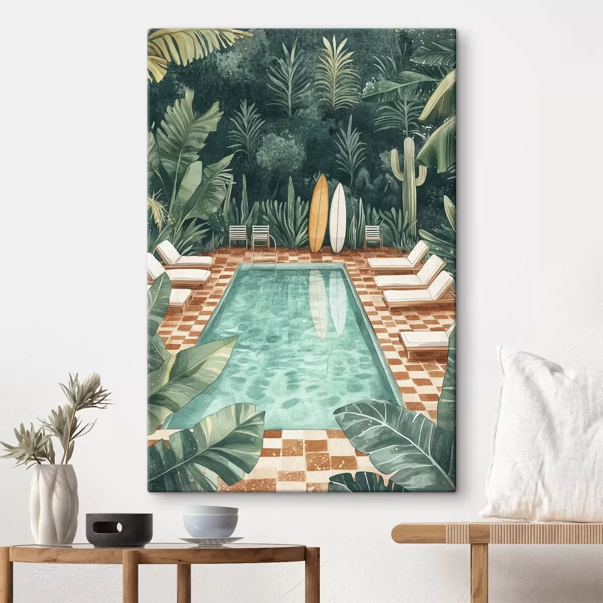 Cuadros Piscina de verano vintage, bosque tropical, vegetación, palmeras, estilo acuarela Nr s43191