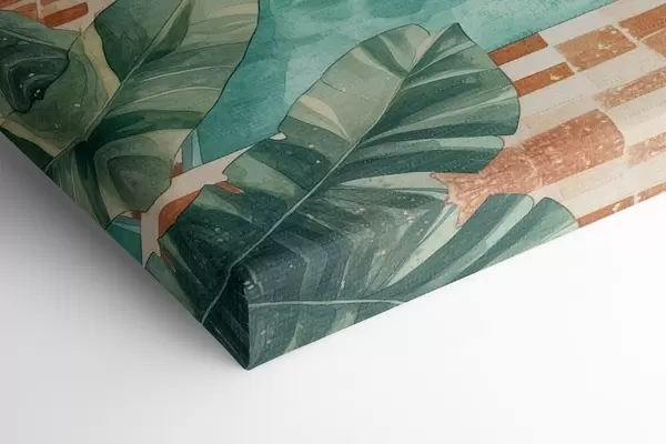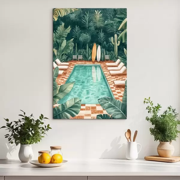 Cuadros Piscina de verano vintage, bosque tropical, vegetación, palmeras, estilo acuarela Nr s43191