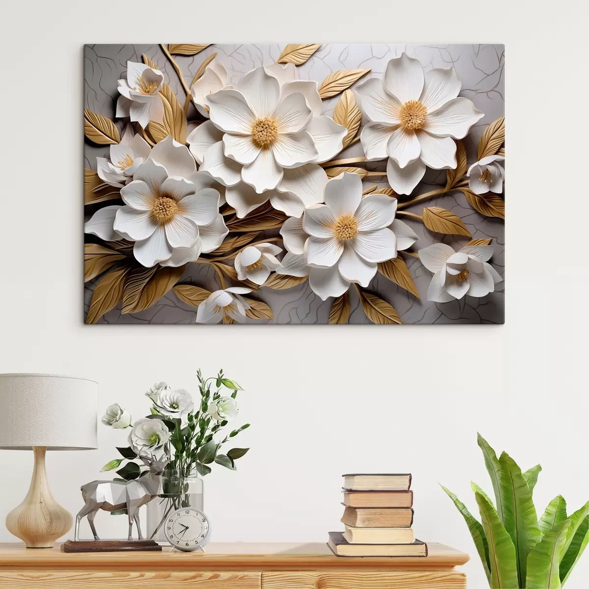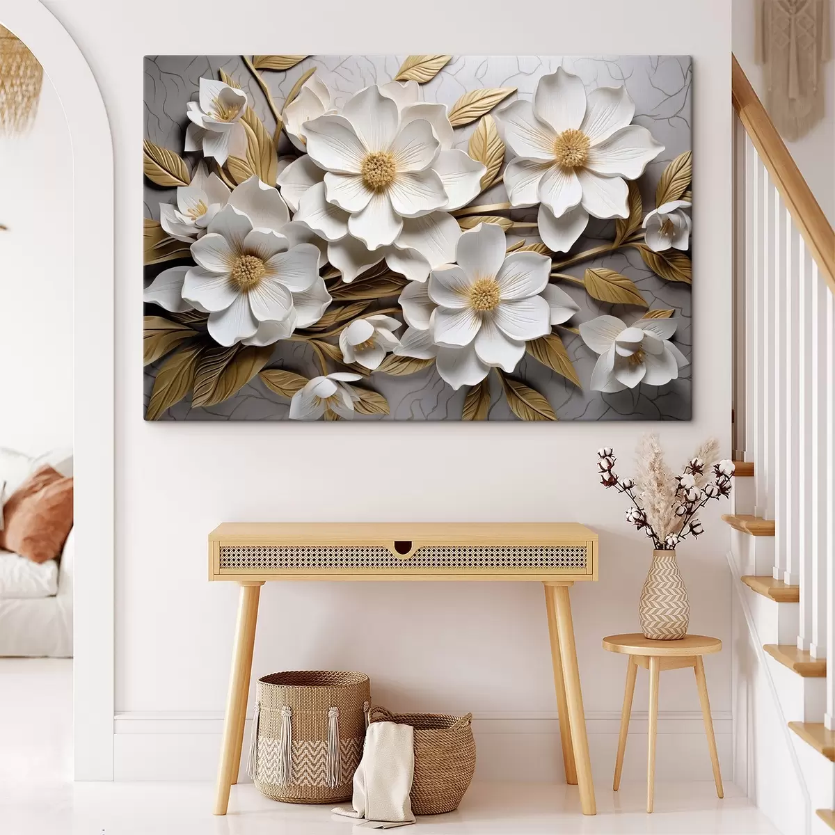 Cuadros Flores blancas al estilo de un fresco en relieve con hojas y estambres amarillos Nr s43330