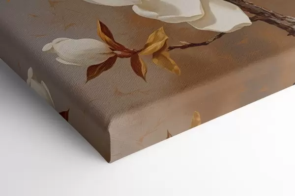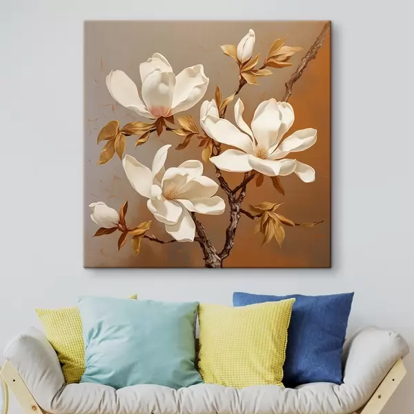 Cuadros Pintura al óleo con una magnolia blanca en una rama sobre fondo amarillo Nr s43361