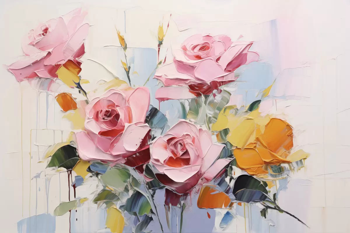 murales de pared Arte abstracto moderno de rosas rosas y amarillas con hojas, pinceladas gruesas, imitación de pintura al óleo, colores pastel s43392