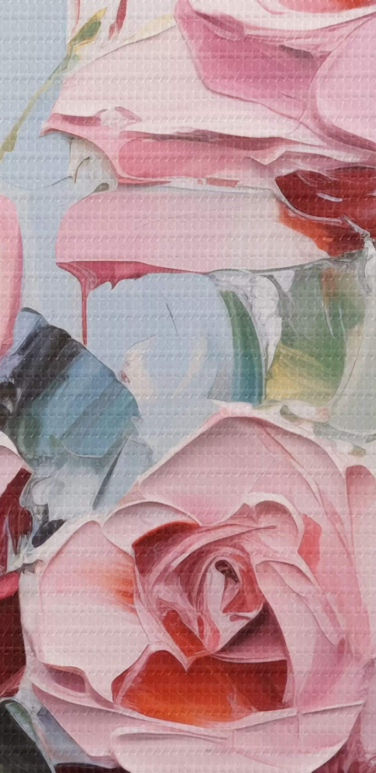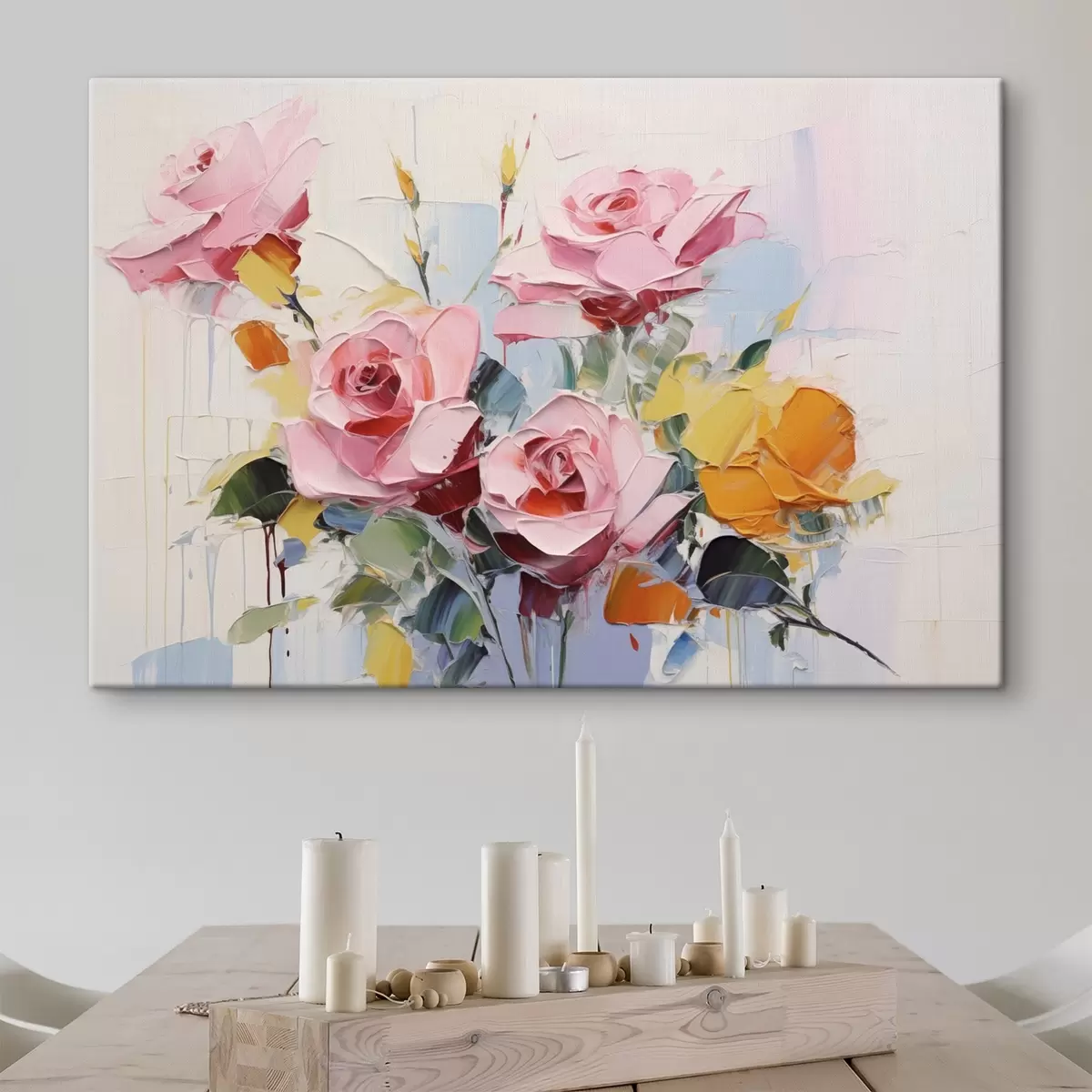 Cuadros Arte abstracto moderno de rosas rosas y amarillas con hojas, pinceladas gruesas, imitación de pintura al óleo, colores pastel Nr s43392