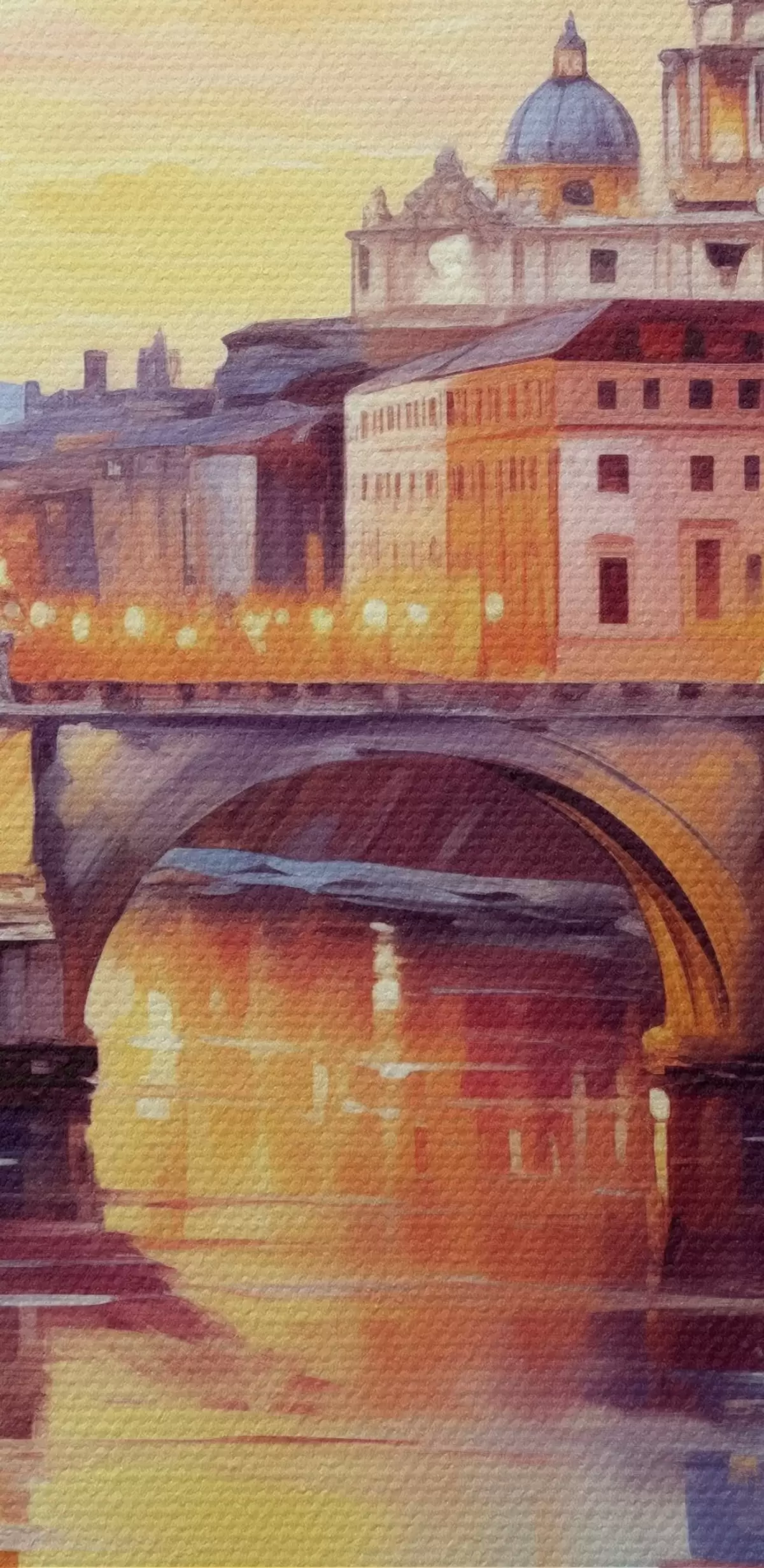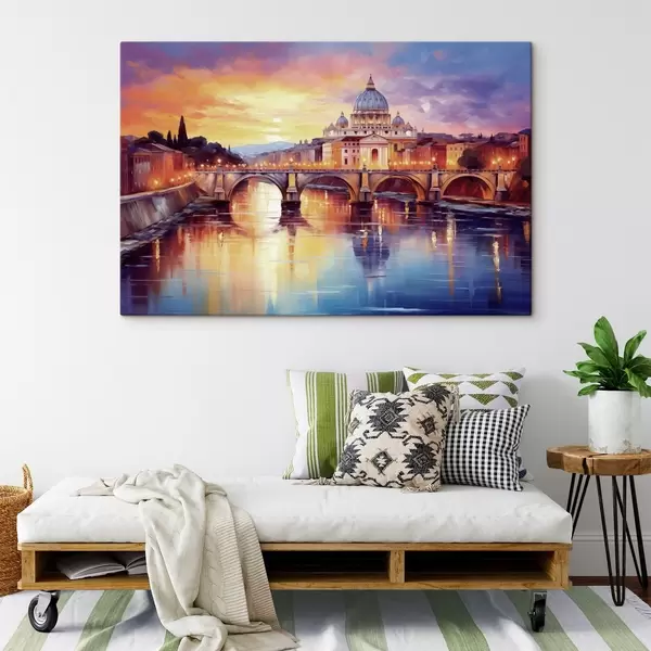 Cuadros Basílica de San Pedro y puente sobre el río al atardecer, colores cálidos, reflejo en el agua, estilo pintura al óleo Nr s43396