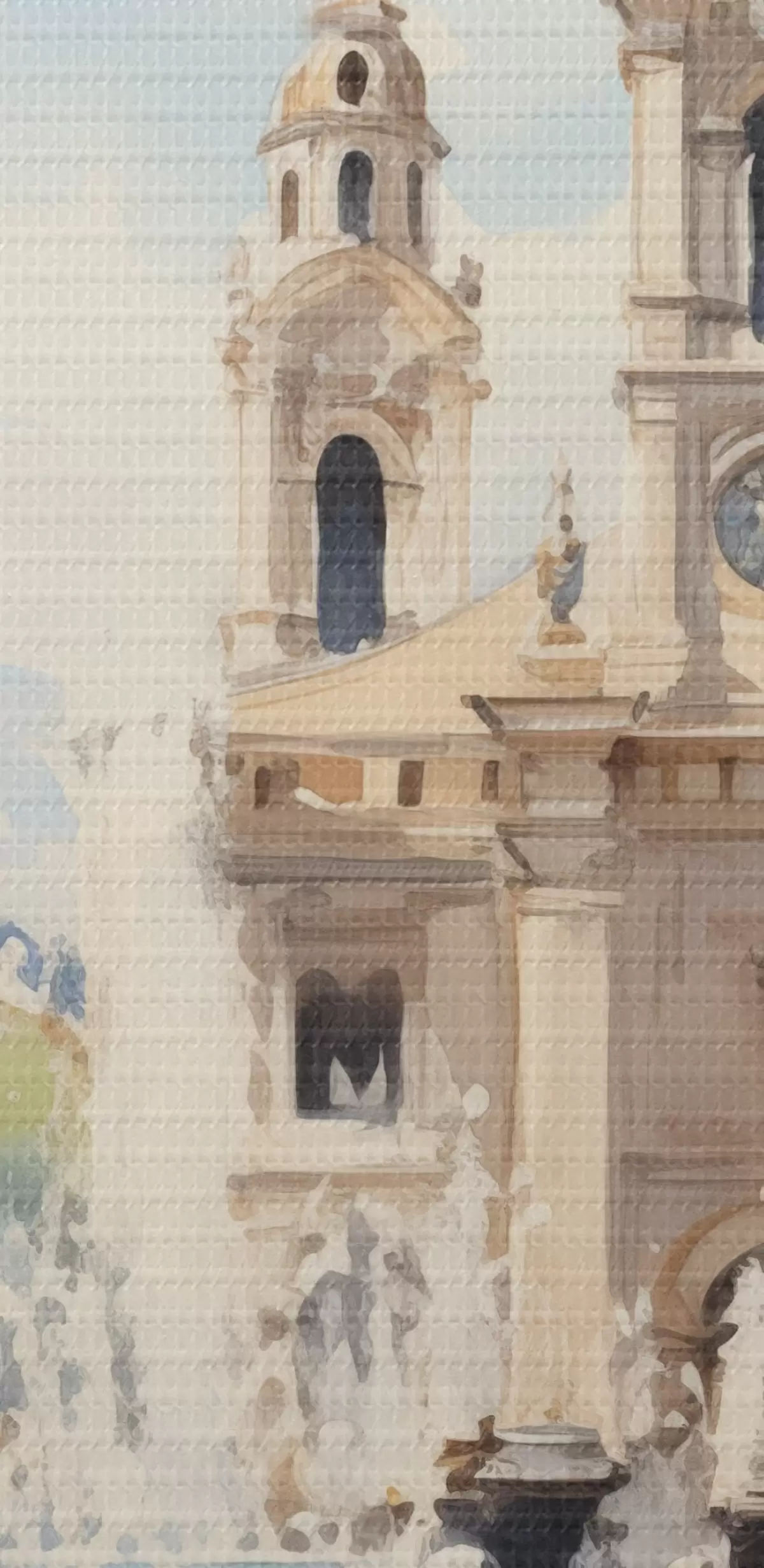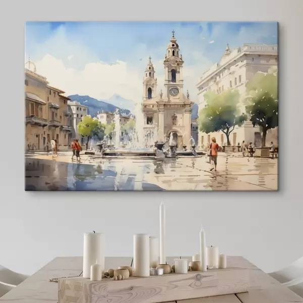 Cuadros Paisaje urbano abstracto con torre y una fuente en una plaza, montañas en la distancia, estilo acuarela Nr s43397