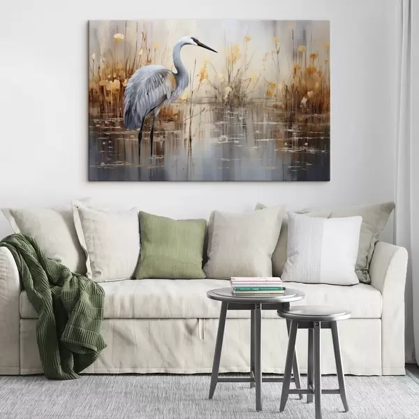 Cuadros Una garza real de pie en un estanque , rodeada de plantas altas y delgadas, el fondo es una suave mezcla de beige y blanco Nr s43398