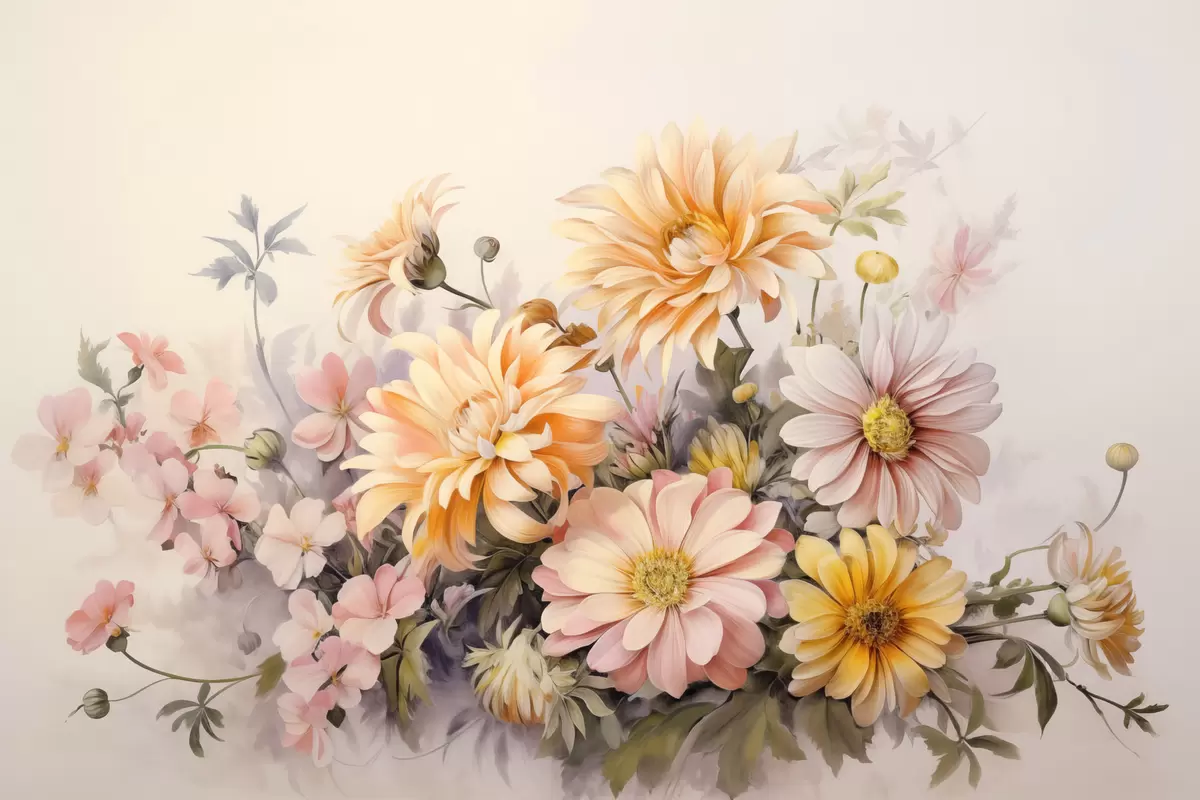 murales de pared Colección de flores rosas, amarillas y naranjas, fondo claro, colores suaves, estilo vintage, ilustración botánica s43401