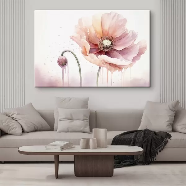 Cuadros Una flor de amapola de color rosa con un capullo sobre un fondo blanco, acuarela pintura de imitación con goteos, colores suaves Nr s43402
