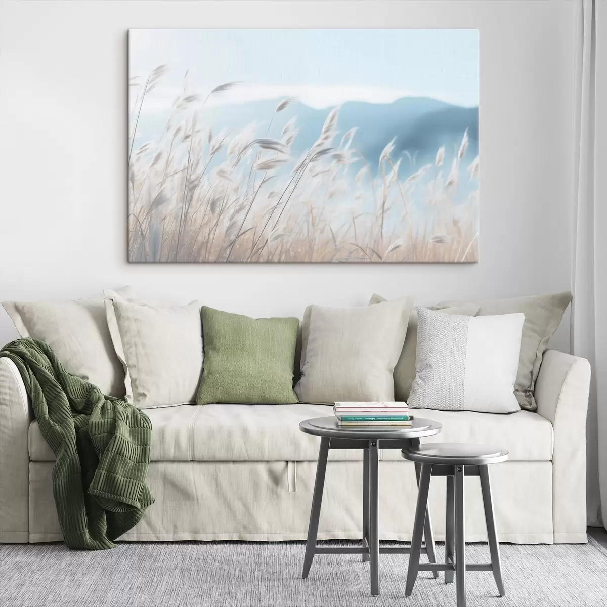 Cuadros Hierba, campo pampeano con una montaña azul de fondo, cielo azul claro, minimalista, colores pastel Nr s43404