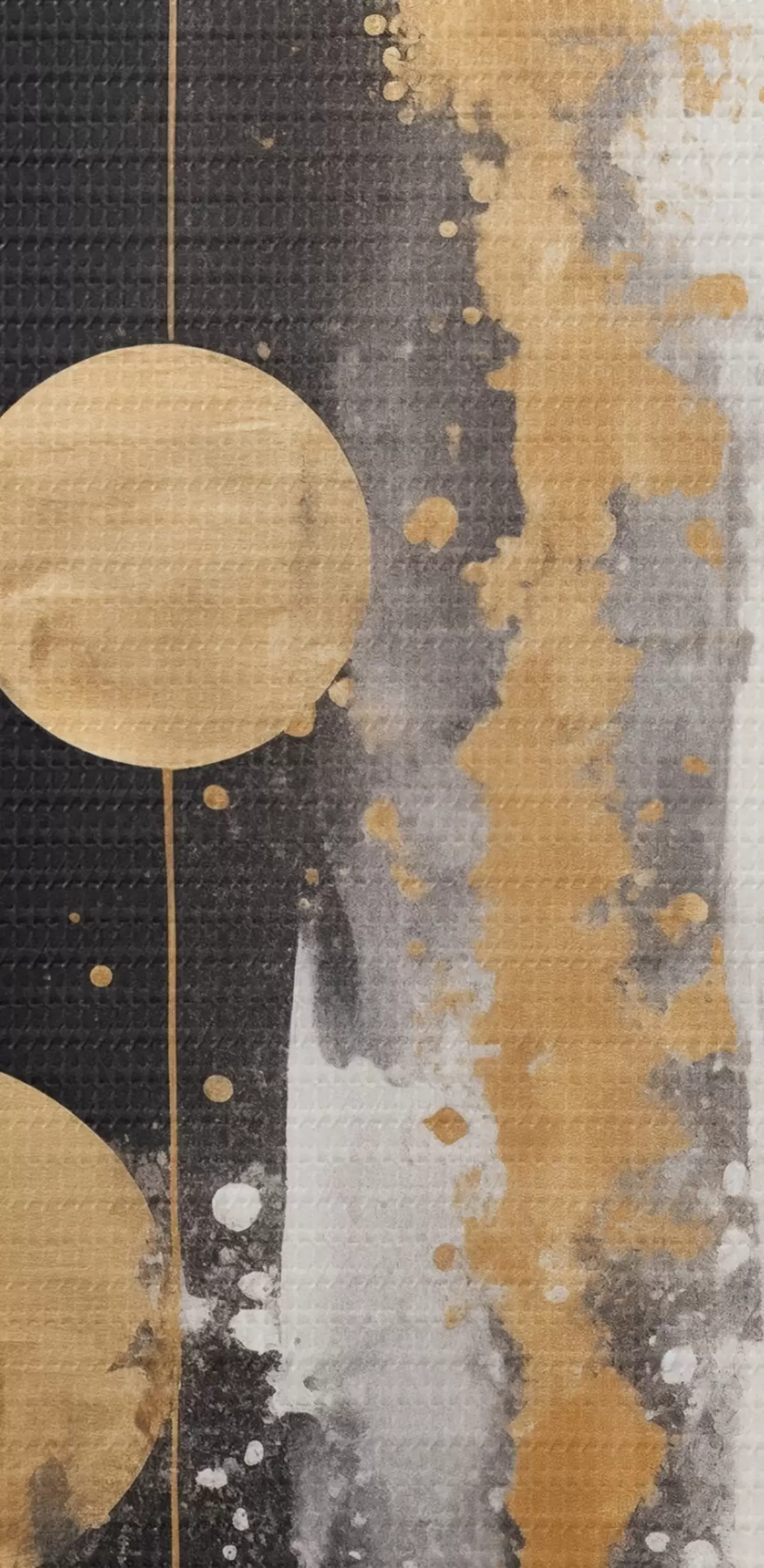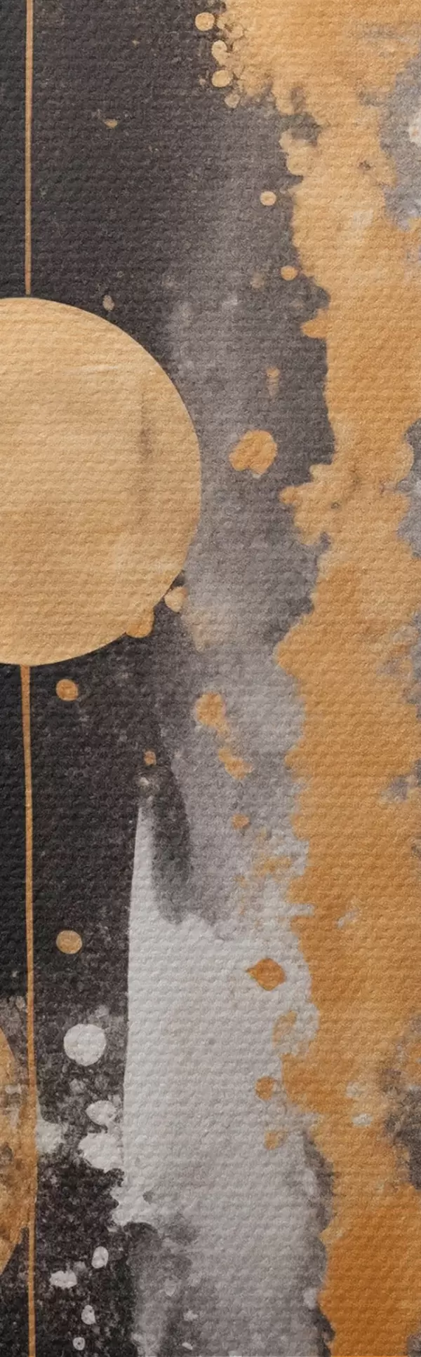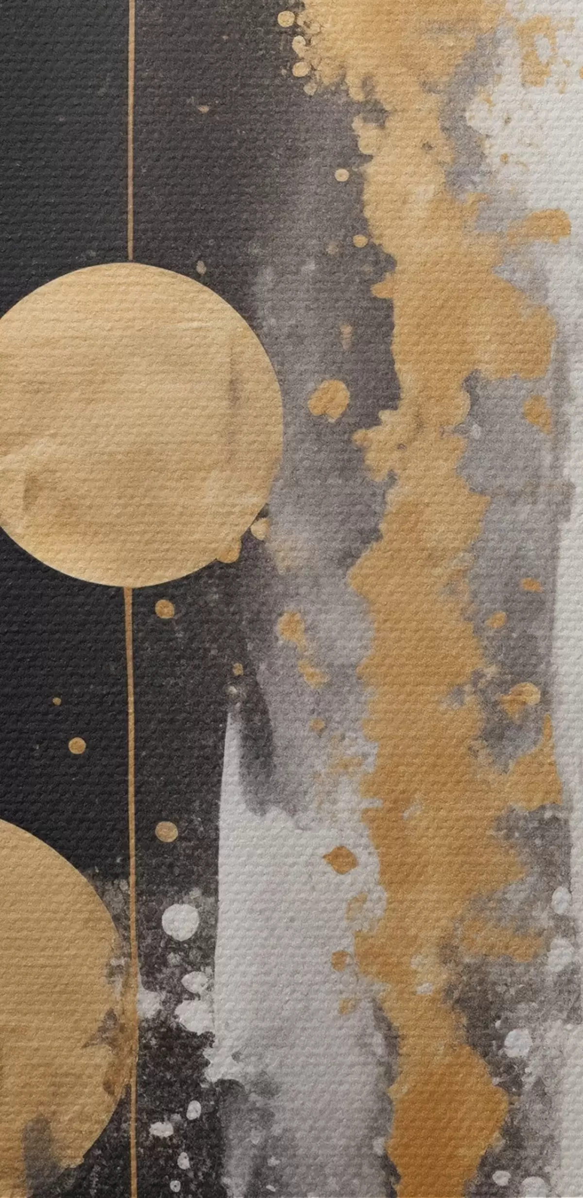 Cuadros Arte abstracto con círculos amarillos colgando sobre fondo blanco y negro con manchas blancas y amarillas Nr s43410