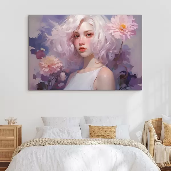 Cuadros Hermosa chica en las flores, dibujo estilo acrílico, Japón, colores púrpura Nr s43495