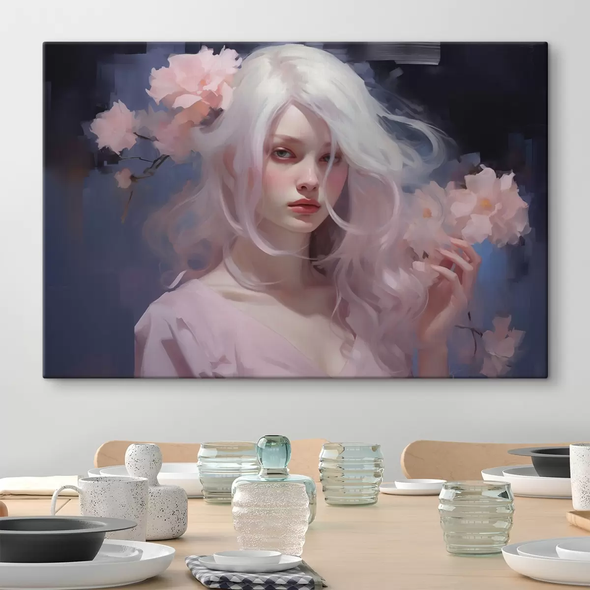 Cuadros Niña con peonías, dibujo estilo acrílico, fondo oscuro Nr s43496