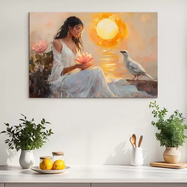 Cuadros Mujer con flor de loto en la puesta de sol, pájaro blanco, dibujo al óleo Nr s43501