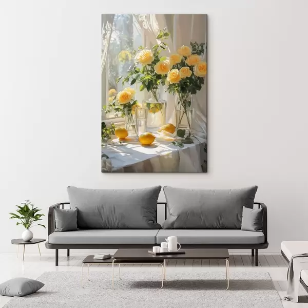 Cuadros Rosas en jarrones, dibujo al óleo, suave luz solar, limones, primavera Nr s43887