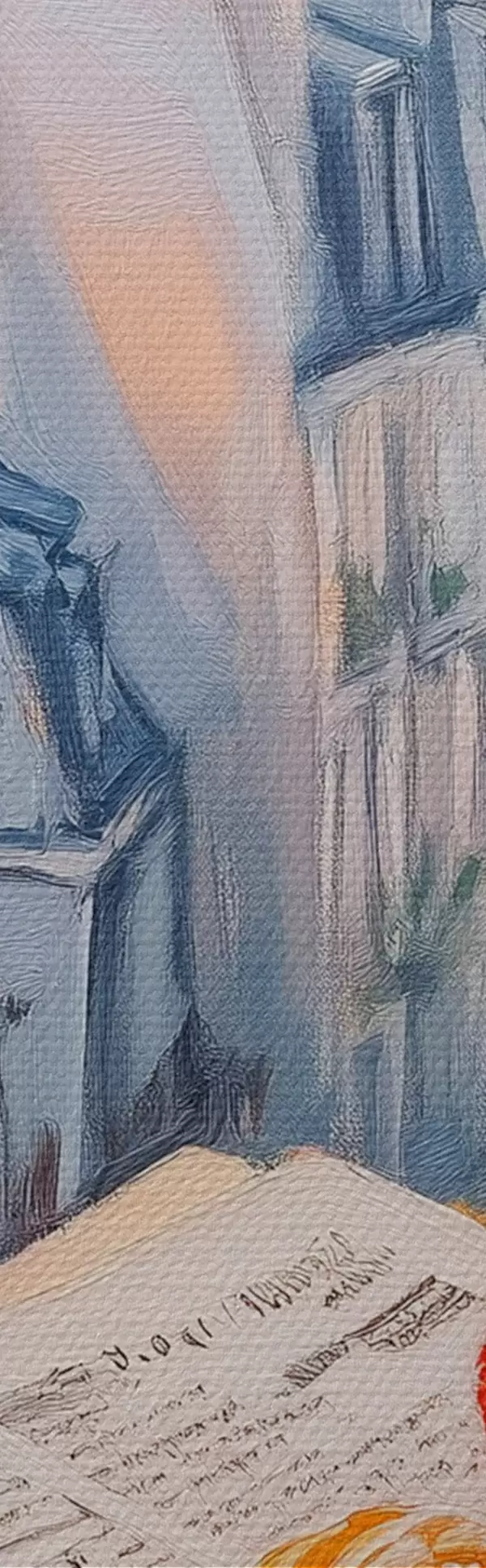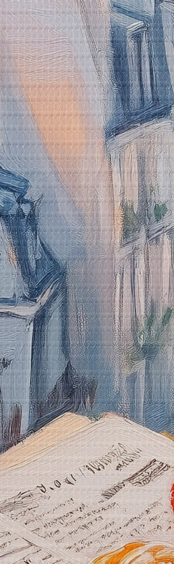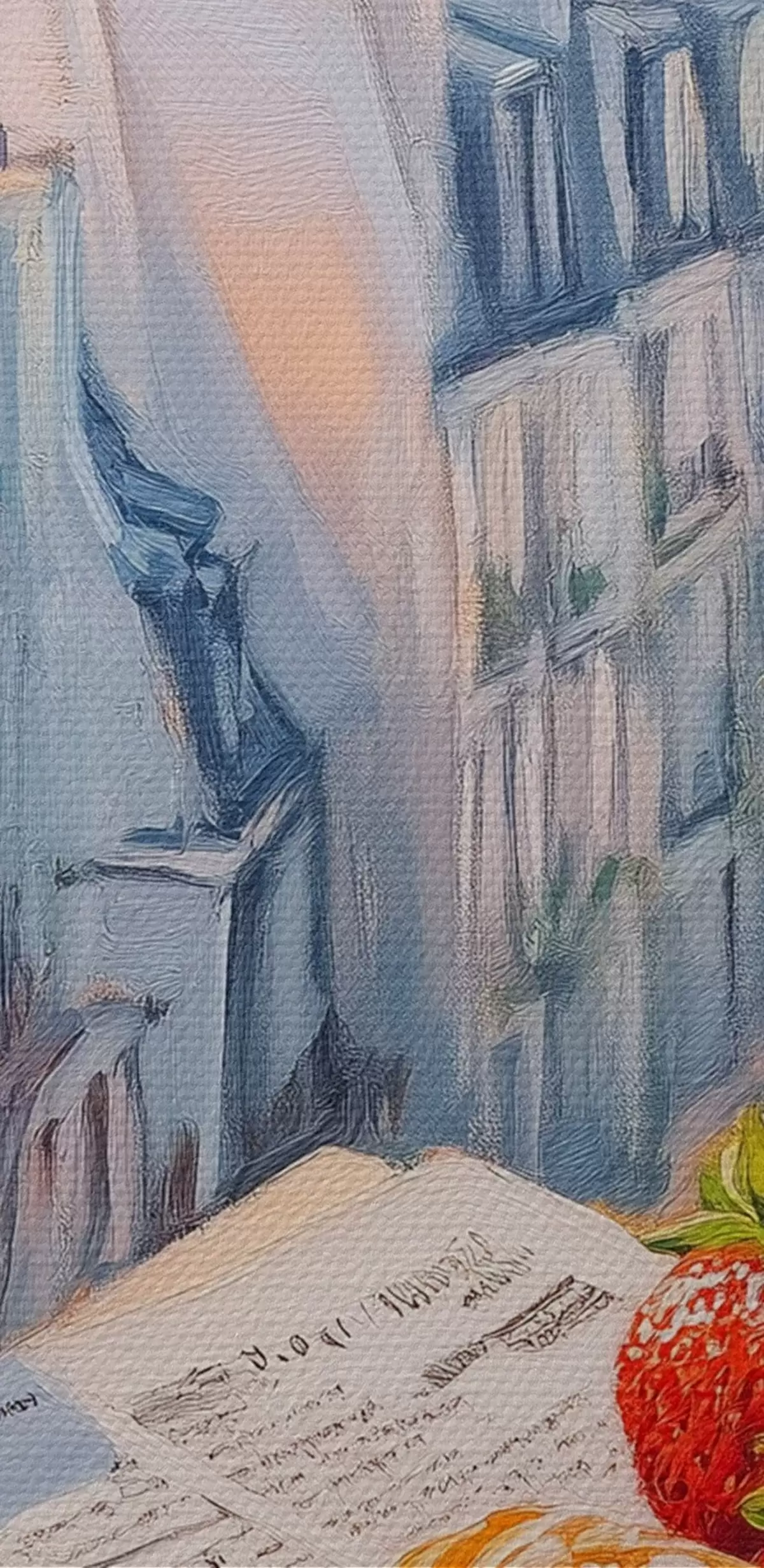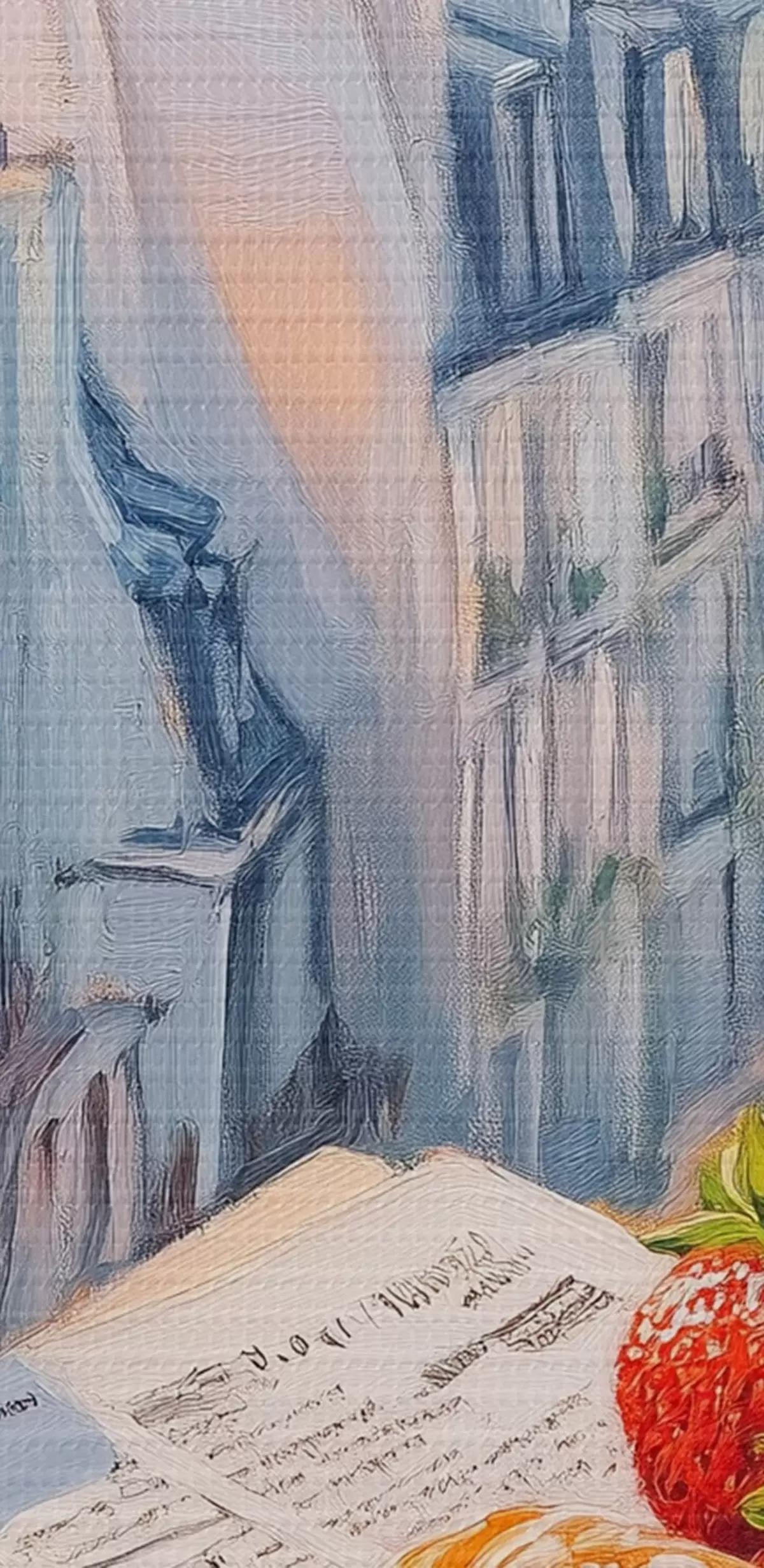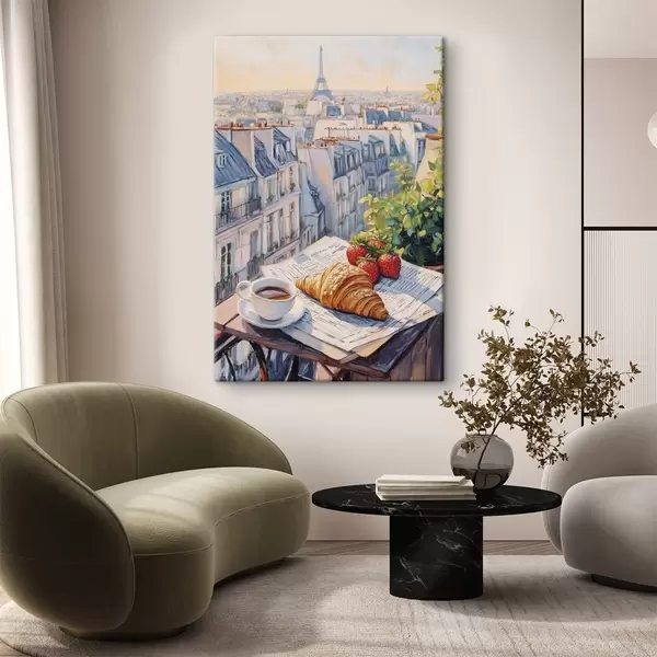Cuadros Amanecer en el balcón de París, Torre Eiffel, fresas, café, diario Nr s43890
