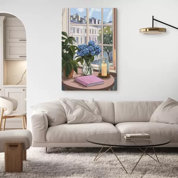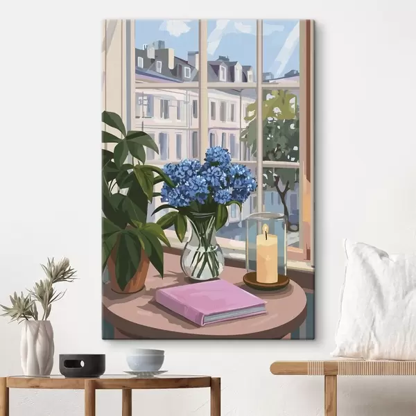 Cuadros Hortensias en el jarrón, vista a la ventana, vela, hogar acogedor Nr s44009