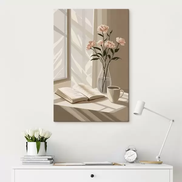 Cuadros Mañana acogedora con café y libro, flores rosas, abstracción Nr s44013