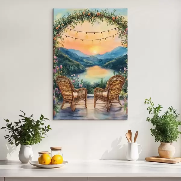 Cuadros Sillas de mimbre en la puesta de sol, paisaje de montaña, estilo boho Nr s44020