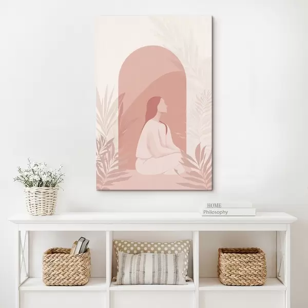 Cuadros Mujer en meditación, estilo plano, plantas tropicales, colores rosas Nr s44154