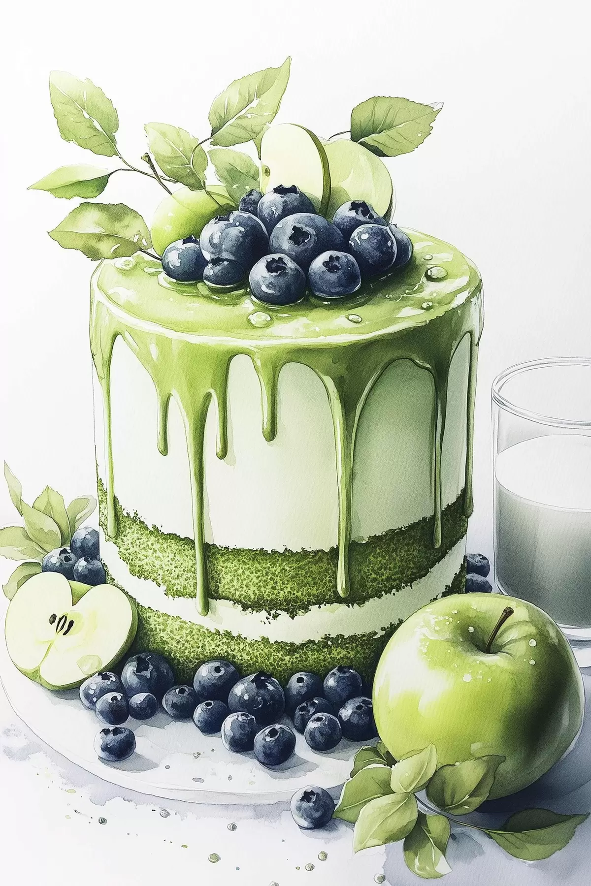 murales de pared Tarta de matcha con arándanos y manzanas, estilo acuarela s44304