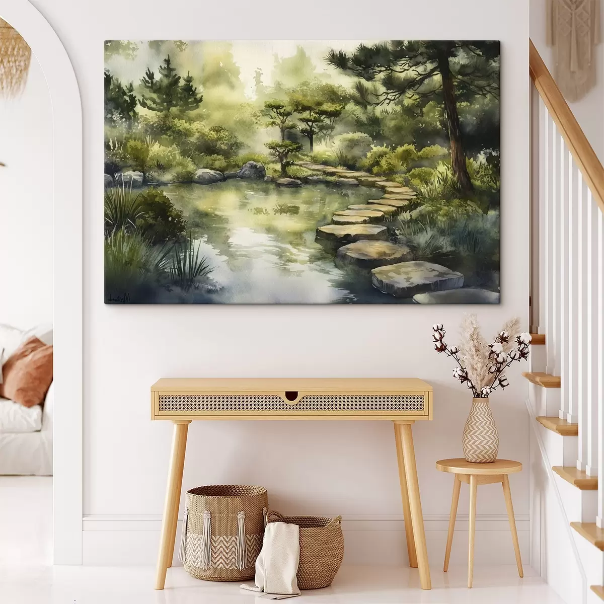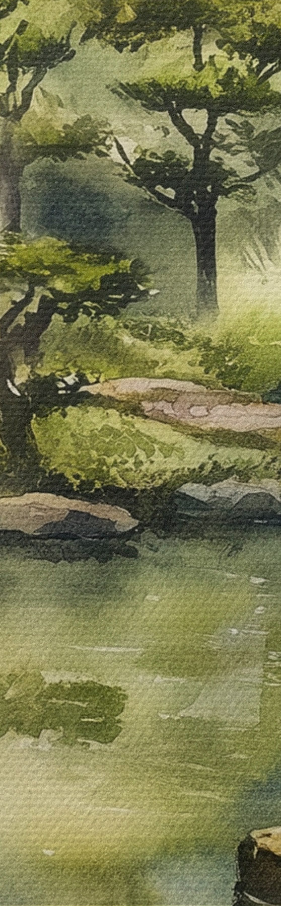 Cuadros Bosque oriental con rocas, estanque y pinos, vegetación, estilo acuarela Nr s44311