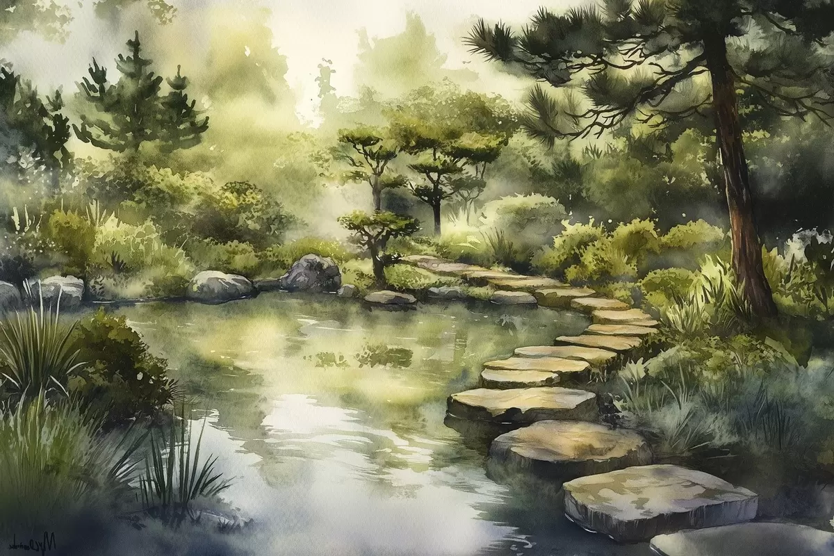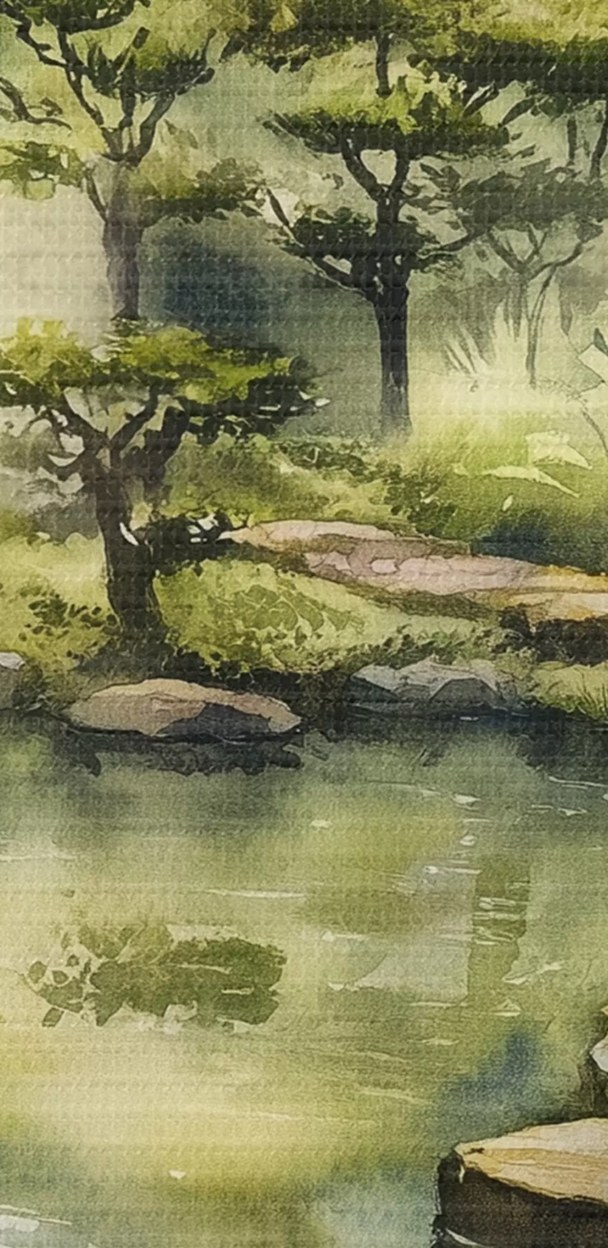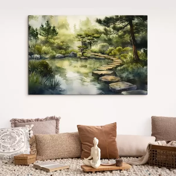 Cuadros Bosque oriental con rocas, estanque y pinos, vegetación, estilo acuarela Nr s44311