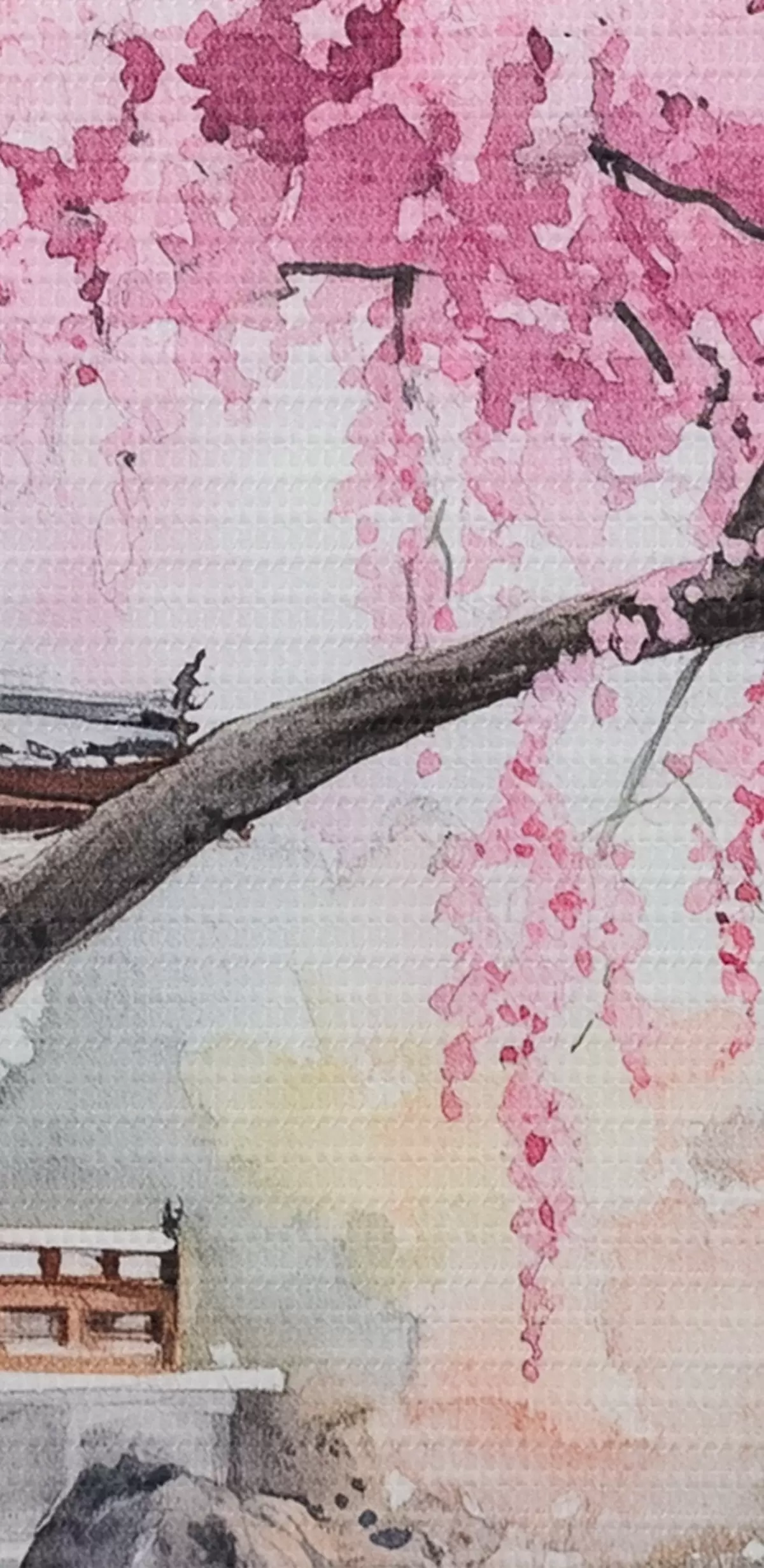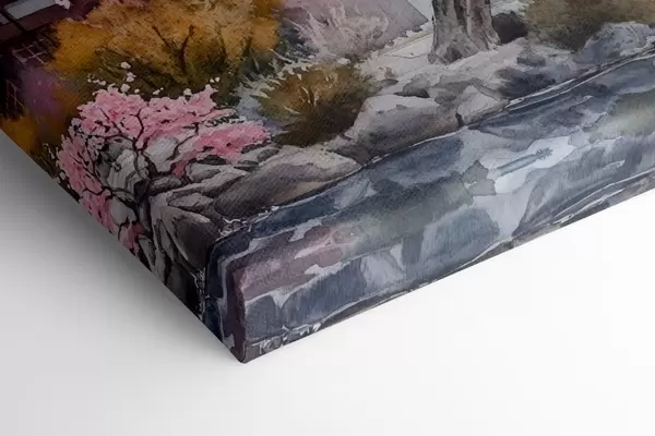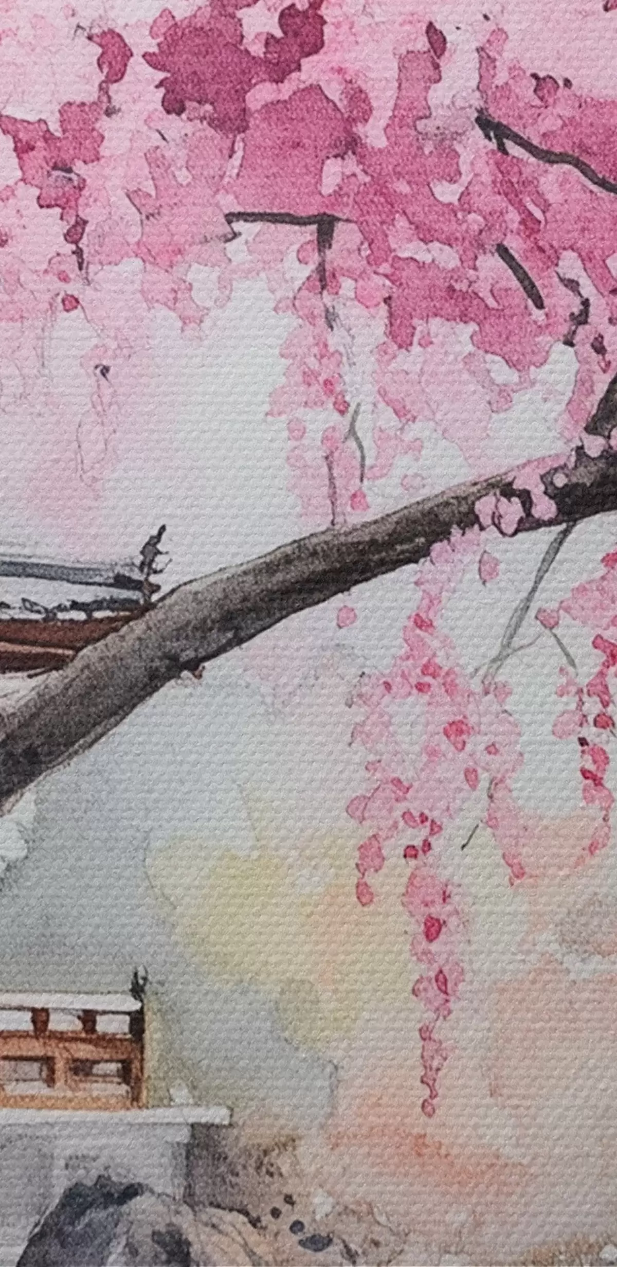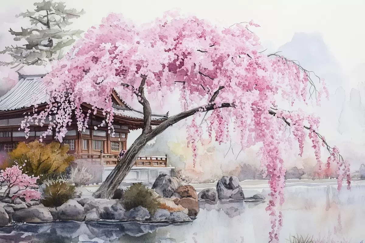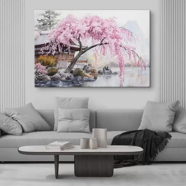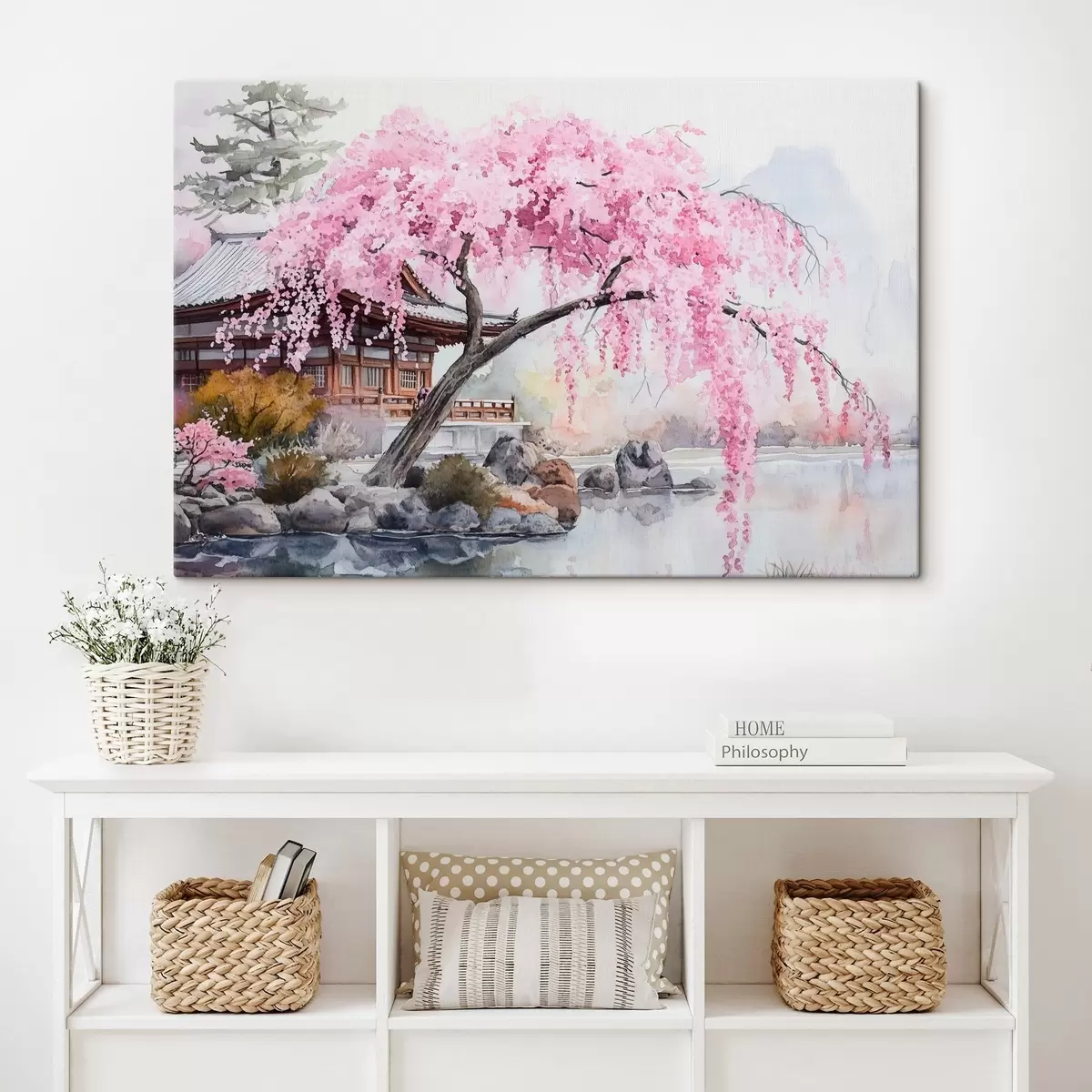 Cuadros Cerezo rosa cerca de casa en el lago, Japón, estilo oriental, acuarela Nr s44312