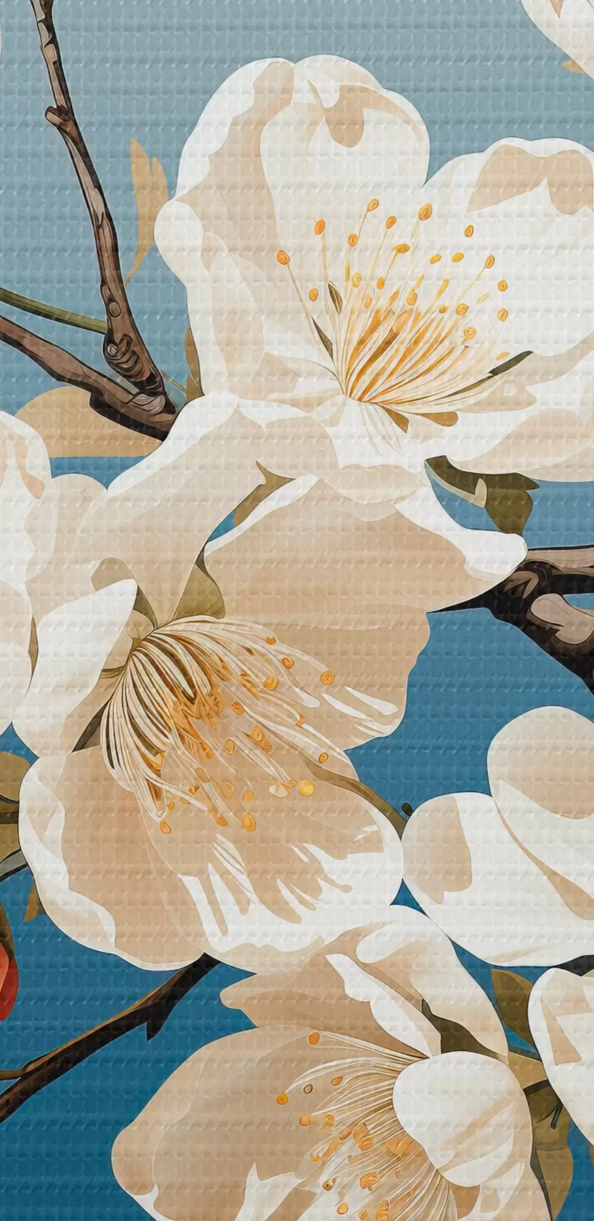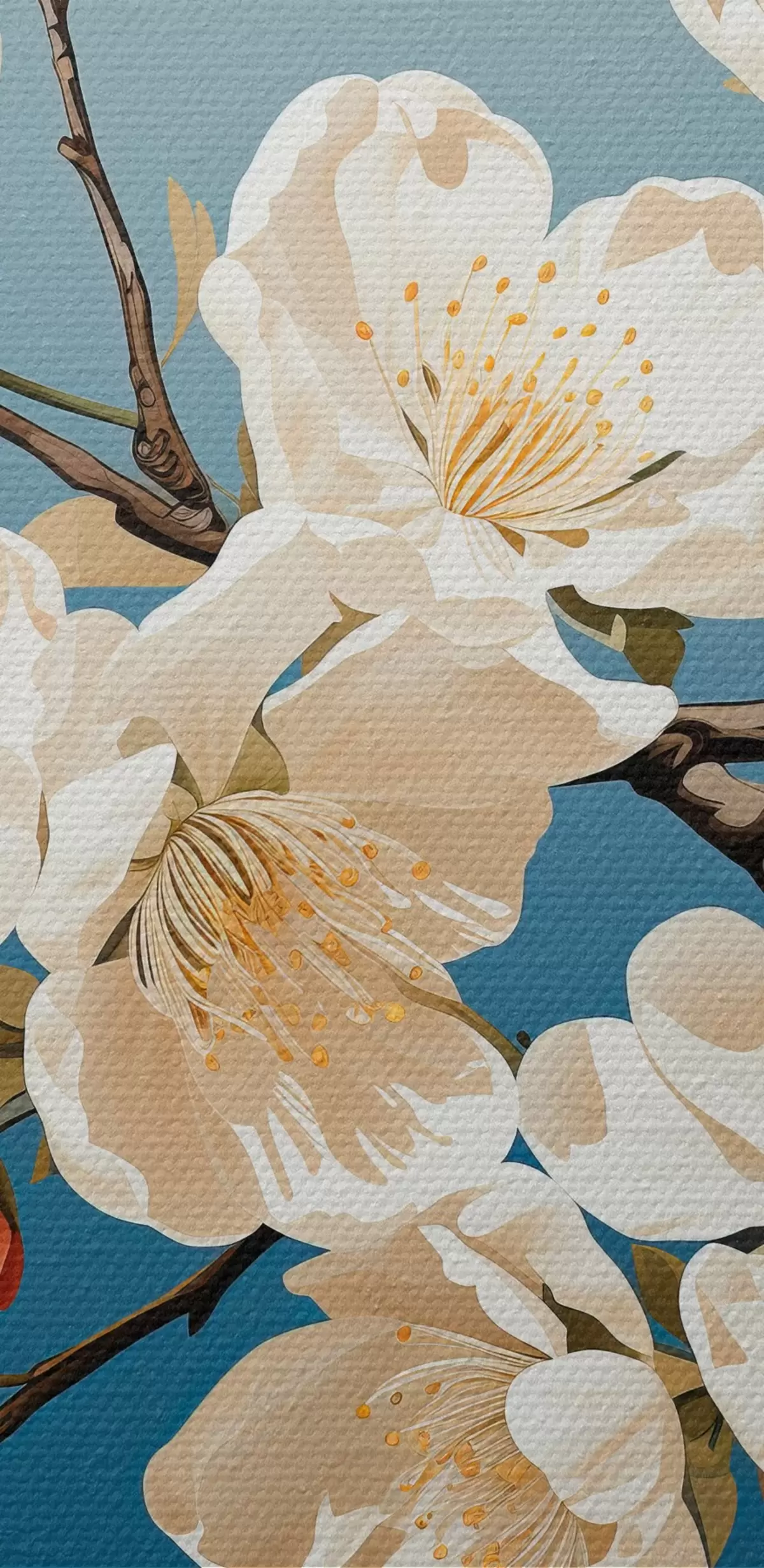 murales de pared Rama de magnolia con capullos rojizos sobre fondo azul s44341