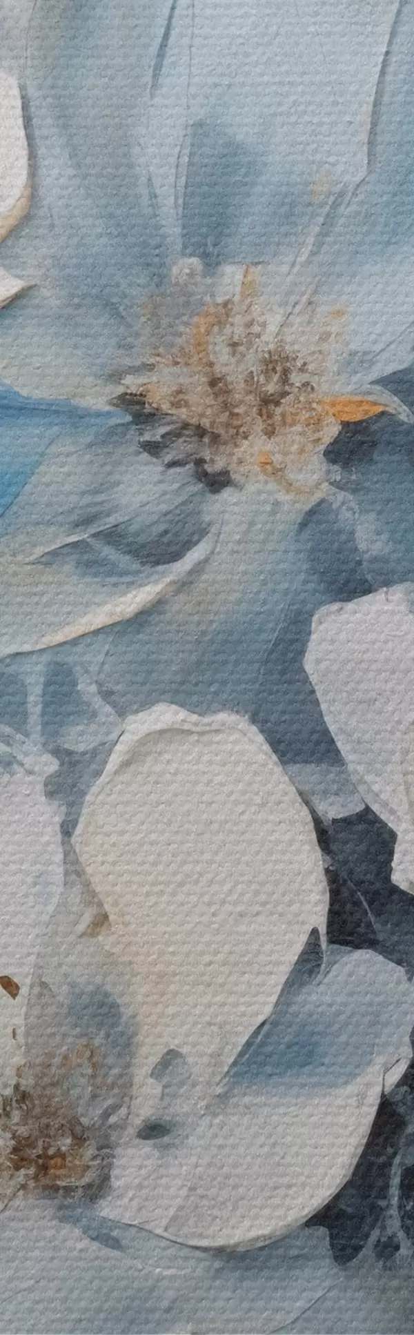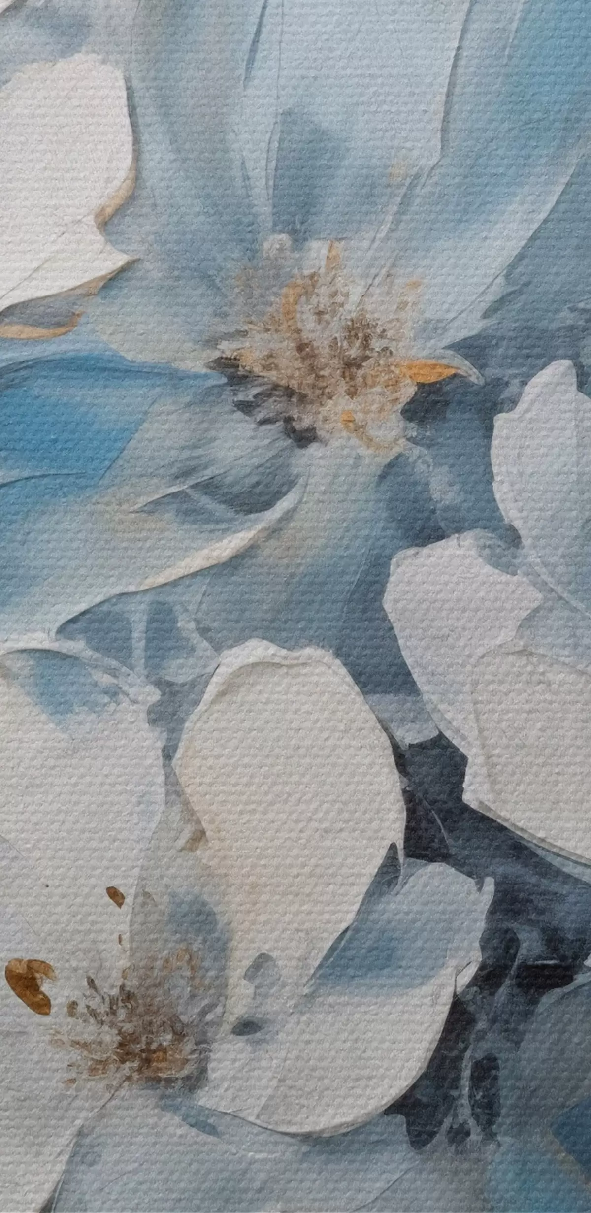 Cuadros Flores blancas con hojas azules, sobre fondo beige claro, con pinceladas visibles Nr s44395