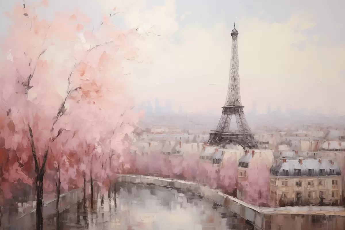 Cuadros Torre Eiffel en París con cerezos en flor en primavera, suaves colores pastel Nr s44398