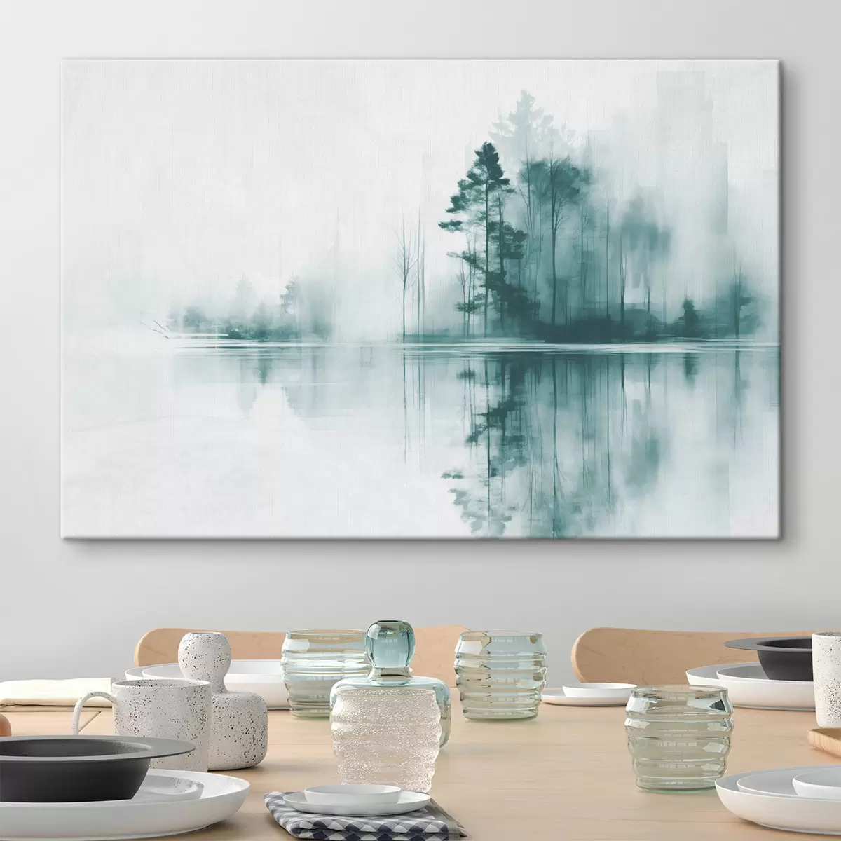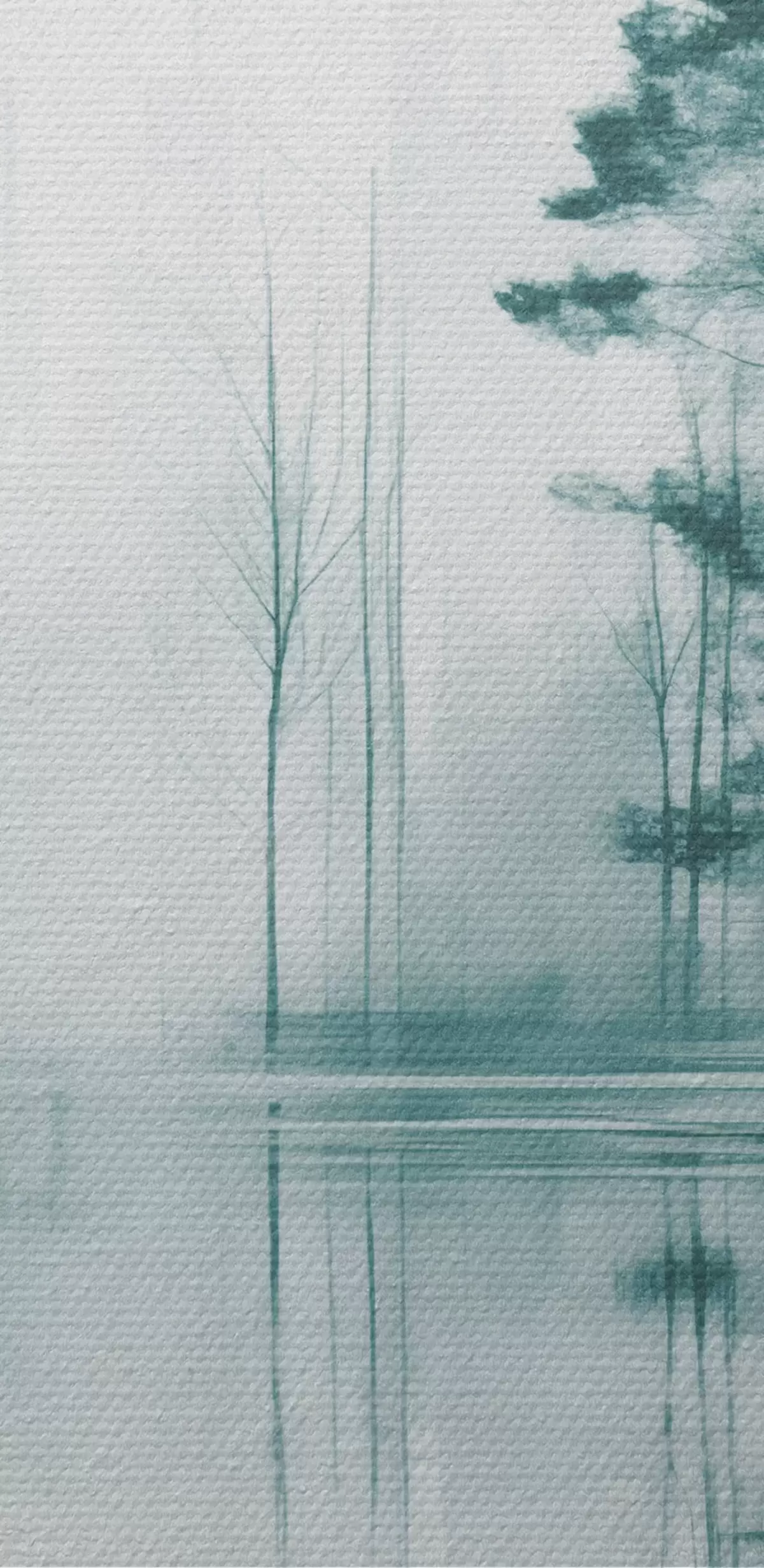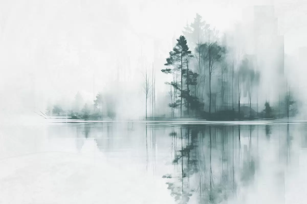 Cuadros Bosque abstracto con altos árboles reflejados en el agua, paleta de colores apagados Nr s44403
