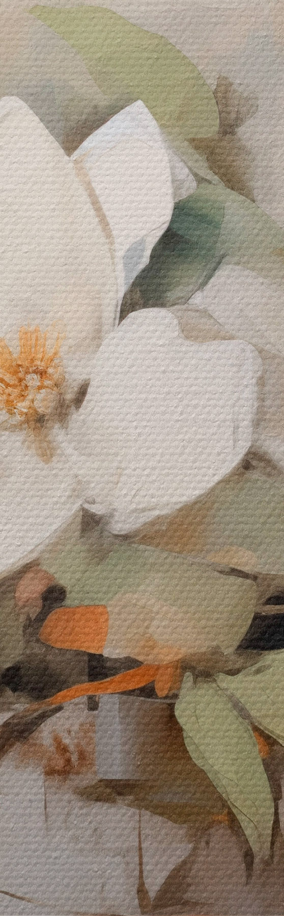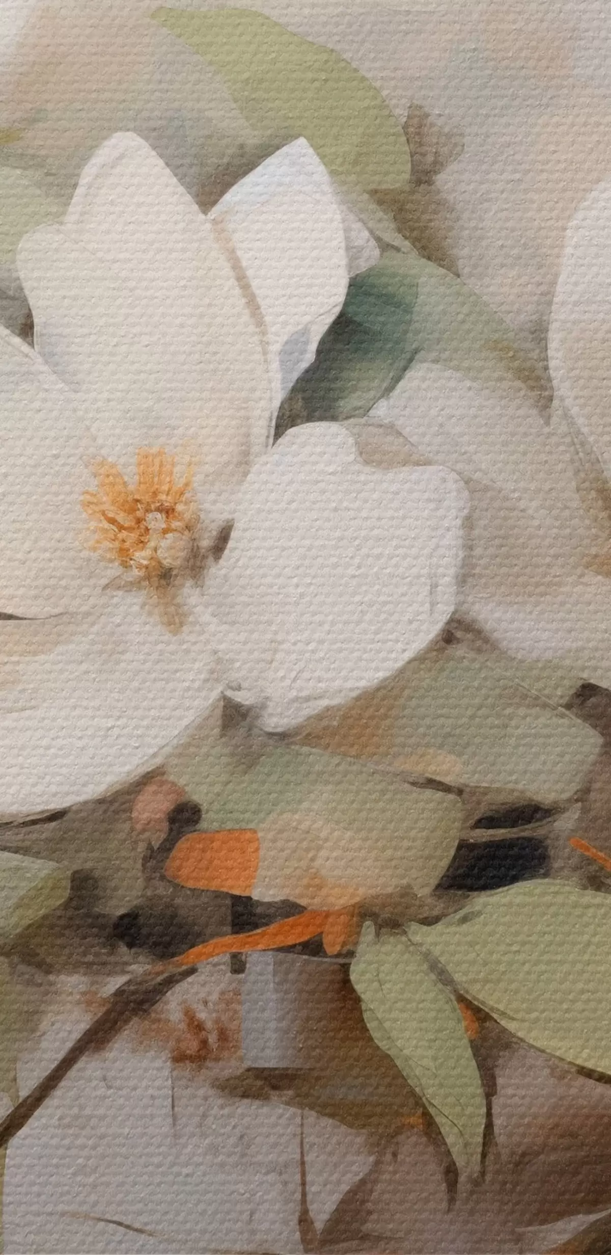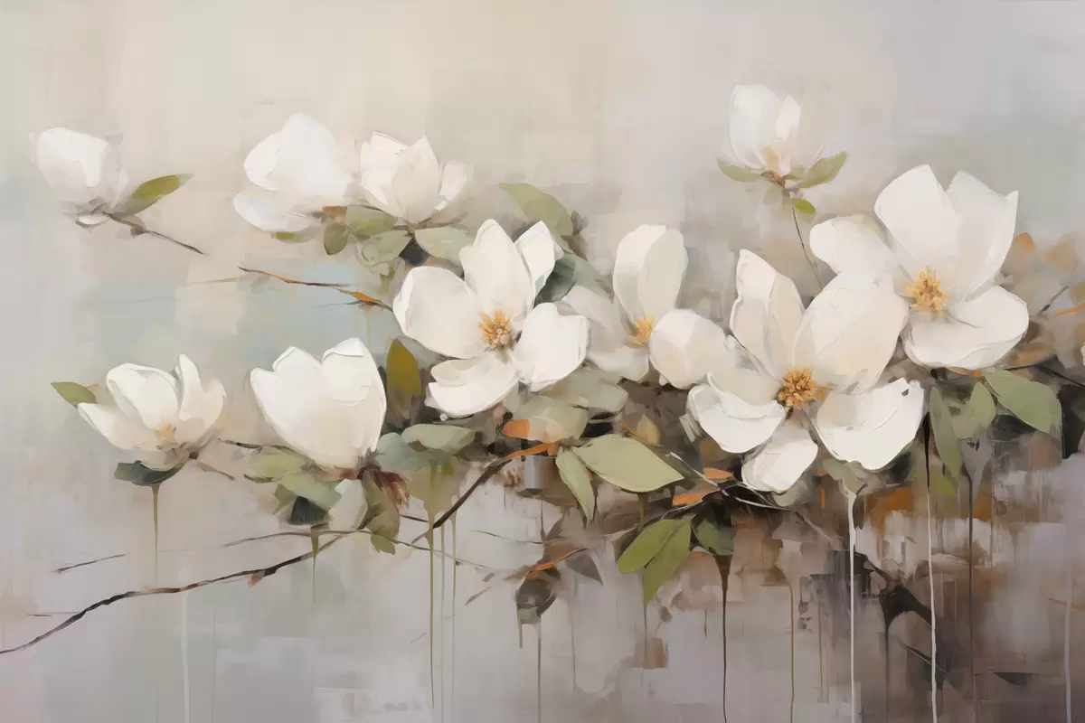 murales de pared Flores blancas de magnolia con hojas verdes en una rama, pinceladas suaves, colores apagados s44404