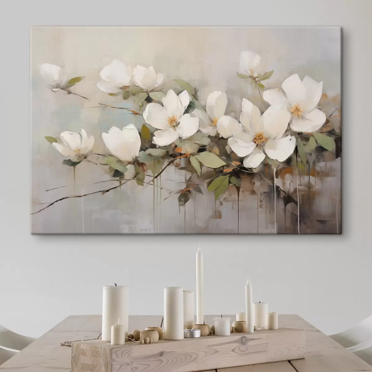 Cuadros Flores blancas de magnolia con hojas verdes en una rama, pinceladas suaves, colores apagados Nr s44404