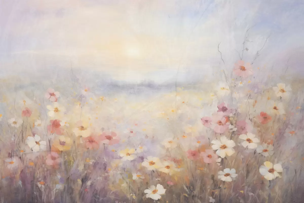 Cuadros Paisaje soleado texturizado de campo de flores, suaves colores pastel, atmósfera de ensueño Nr s44408