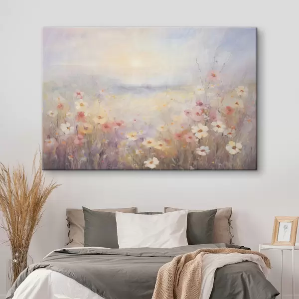 Cuadros Paisaje soleado texturizado de campo de flores, suaves colores pastel, atmósfera de ensueño Nr s44408