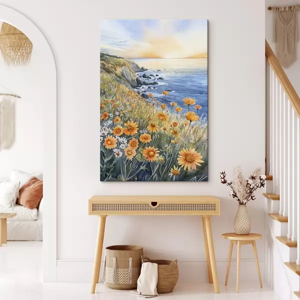 Cuadros Acantilado con flores naranjas, costa oceánica, Portugal, estilo acuarela Nr s44604