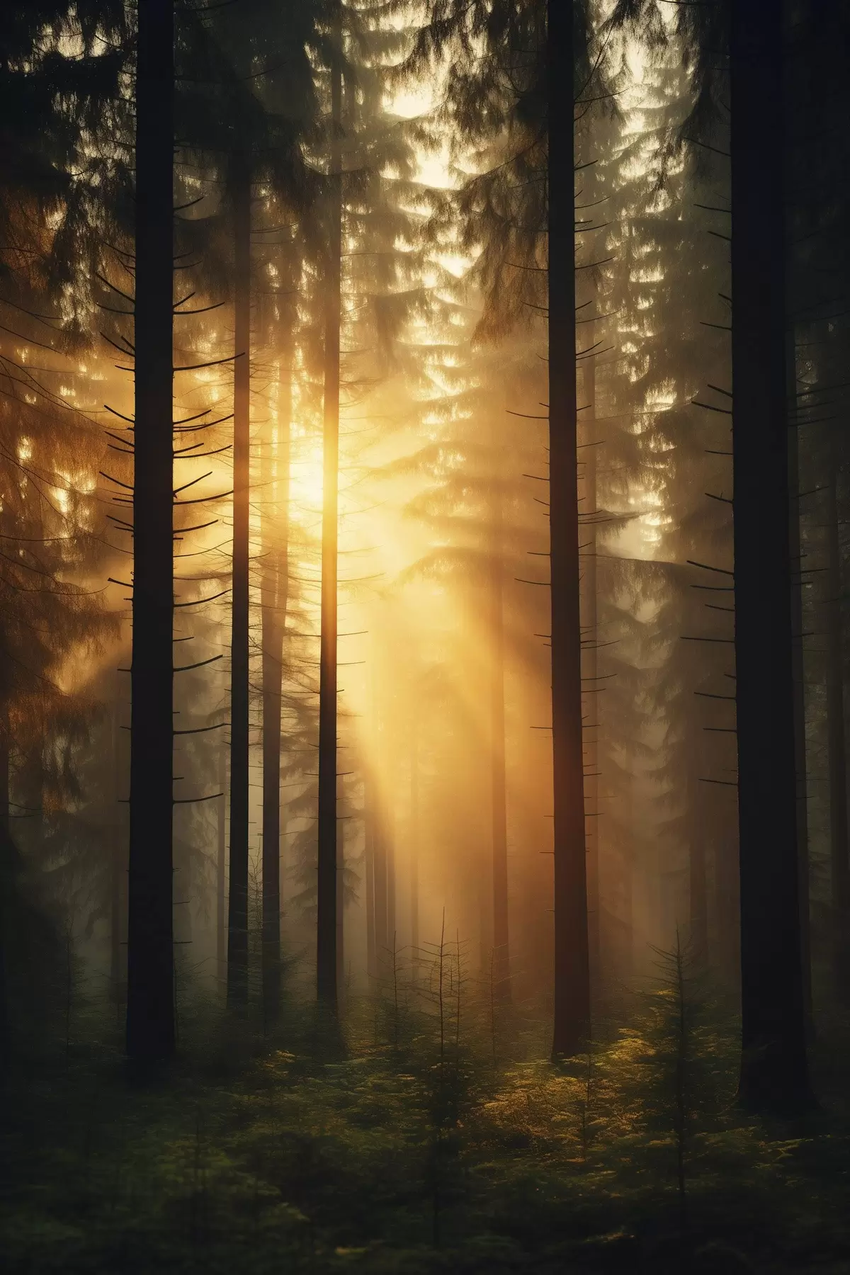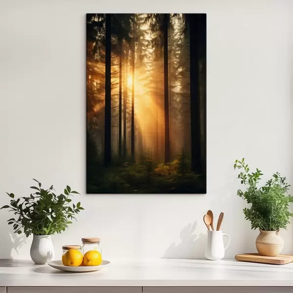 Cuadros Denso bosque de pinos con luz del atardecer, realismo, naturaleza Nr s44615