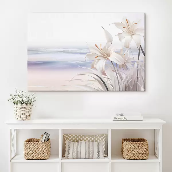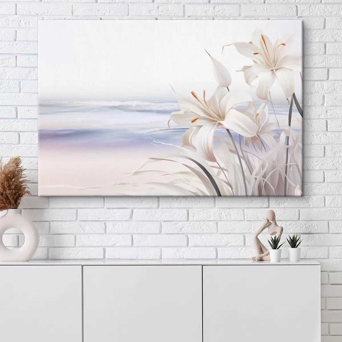 Cuadros Lirios blancos con pistilos naranjas y hojas largas en una playa con suaves olas de fondo, colores pastel Nr s44850