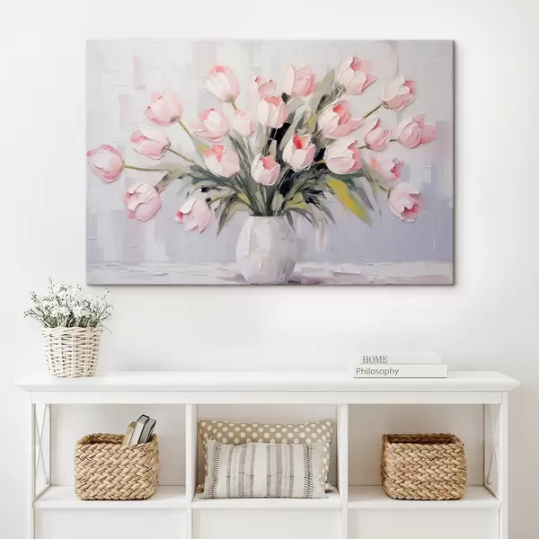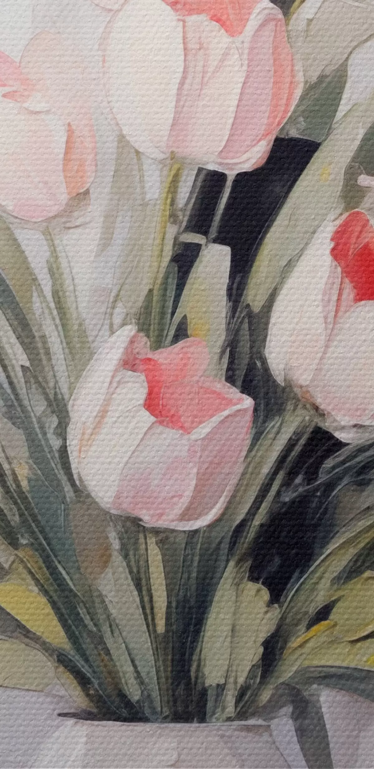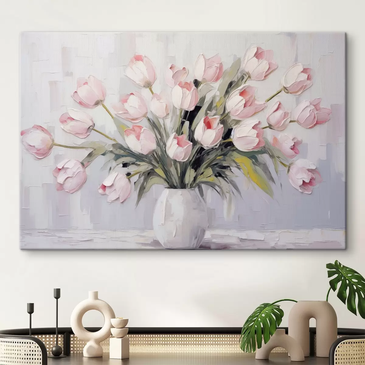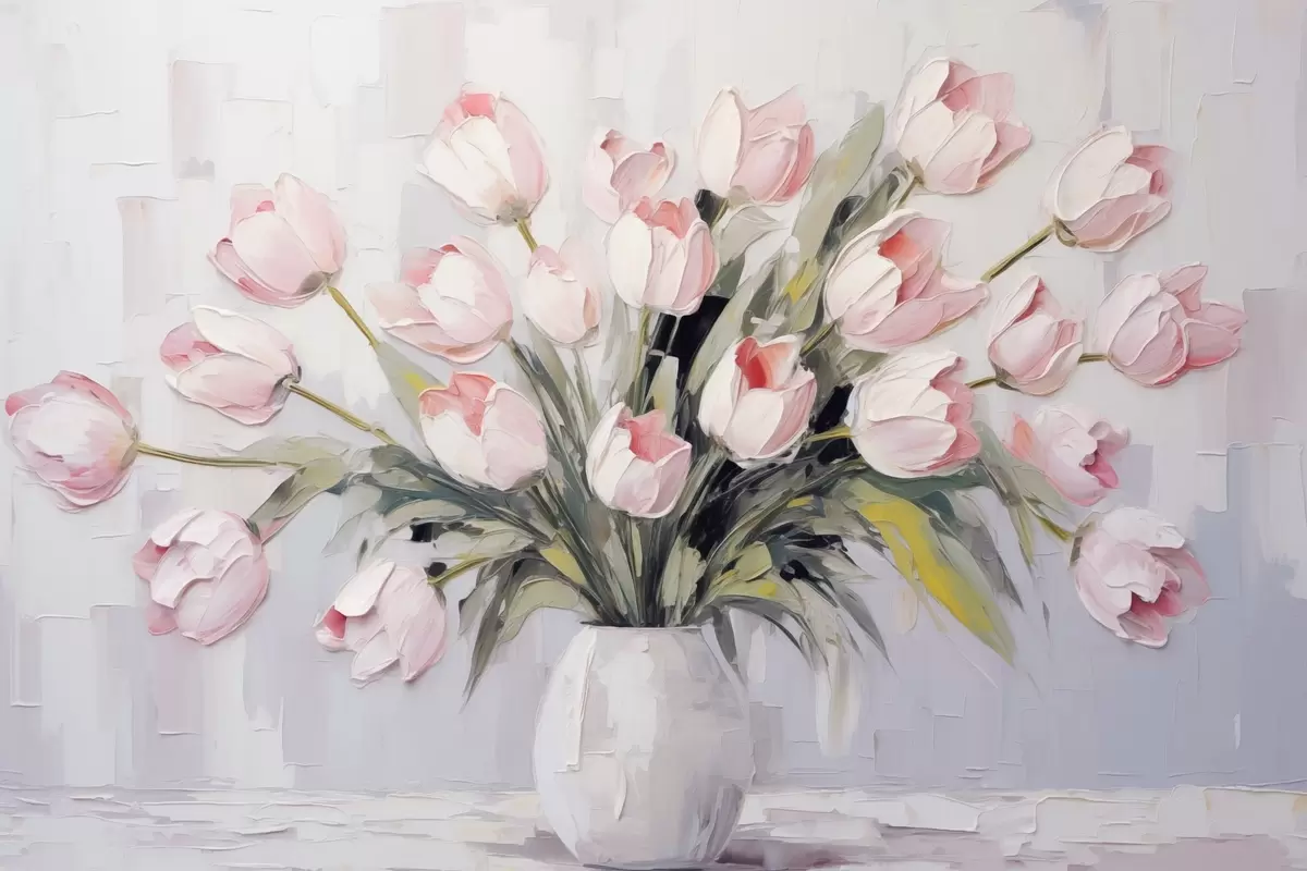 Cuadros Un jarrón con tulipanes rosas, hojas verdes, fondo gris claro , estilo pintura al óleo, pinceladas gruesas Nr s44852